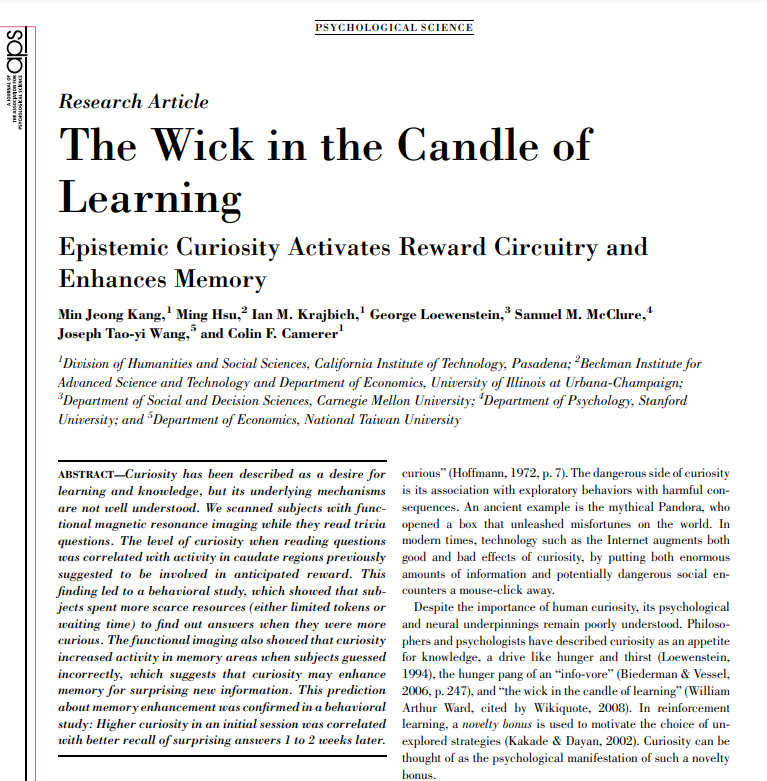 이렇게 유명한 심리학자들의 논문이 모두 등장하는 방구석 심리학 실험실은 이외에도 수많은 연구자의 논문이 등장합니다. 특히 이목을 끌었던 것은 한국인 '강민정' 등이 연구한 "학습에서의 양초 심지 : 인식론적 호기심이 보상 회로를 활성화하고 기억을 향상시킨다"였습니다.