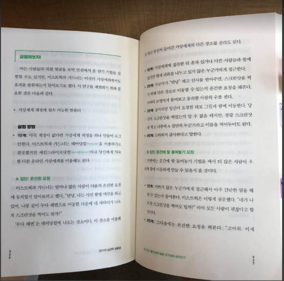 이외에도 집에서 친구와 해볼 수 있는 마피아 게임 같은 실험도 있구요(챕터 45), 학급 친구들도 여럿이서 사진 찍으면서 해볼만 한 실험(챕터 11)도 있습니다. 그리고 자동차 운전 게임을 하면서 해볼만한 실험(챕터 26)도 있습니다. 그뿐만 아니라 필립 짐바도르의 스탠포드 교도소 실험으로 유명한 전기충격 실험도 집에서 포스팅 글에 익명 댓글 작성 실험으로 재구조화하여 직접 해볼 수 있도록 제시(챕터 18)하고 있습니다. 이외에도 재밌고 흥미롭게 집에서 직접 해볼 수 있도록 단계별로 아주 구체적이고 자세하게 실험 방법을 제시하고 있습니다.