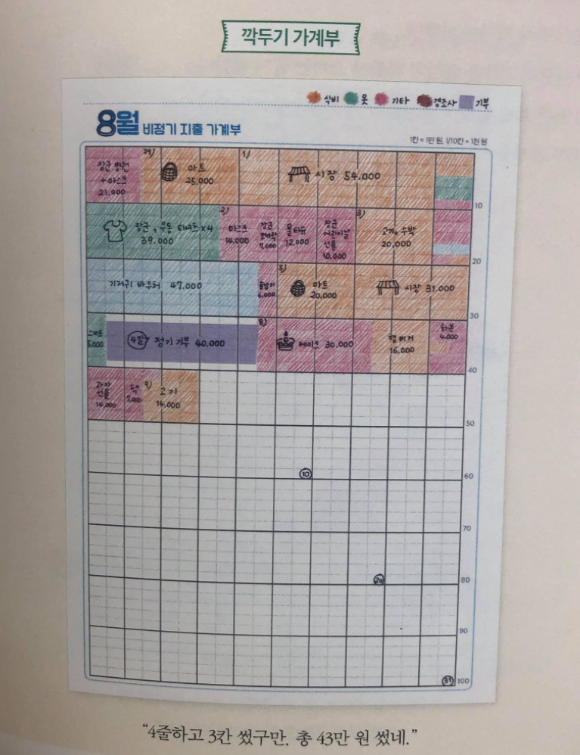 저자는 돈을 애써 모으겠다고 힘들게 절약하지 않았다고 말합니다. 그저 깍두기 가계부 빈 칸이 줄어드는 것을 보면서 때에 맞게 아끼며 살았다고 말합니다.