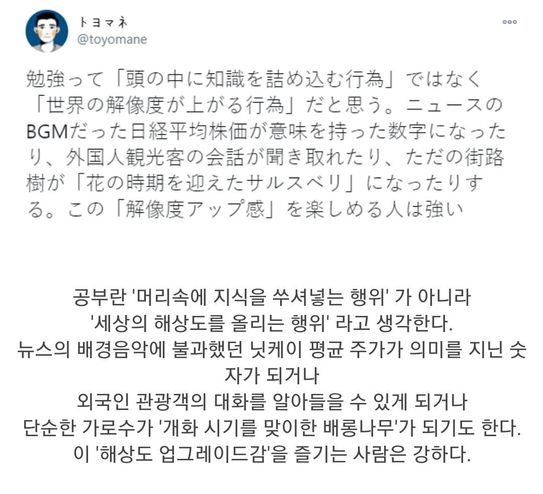 공부란 ‘머리속에 지식을 쑤셔넣는 행위’가 아니라 ‘세상의 해상도를 올리는 행위’라고 생각한다.