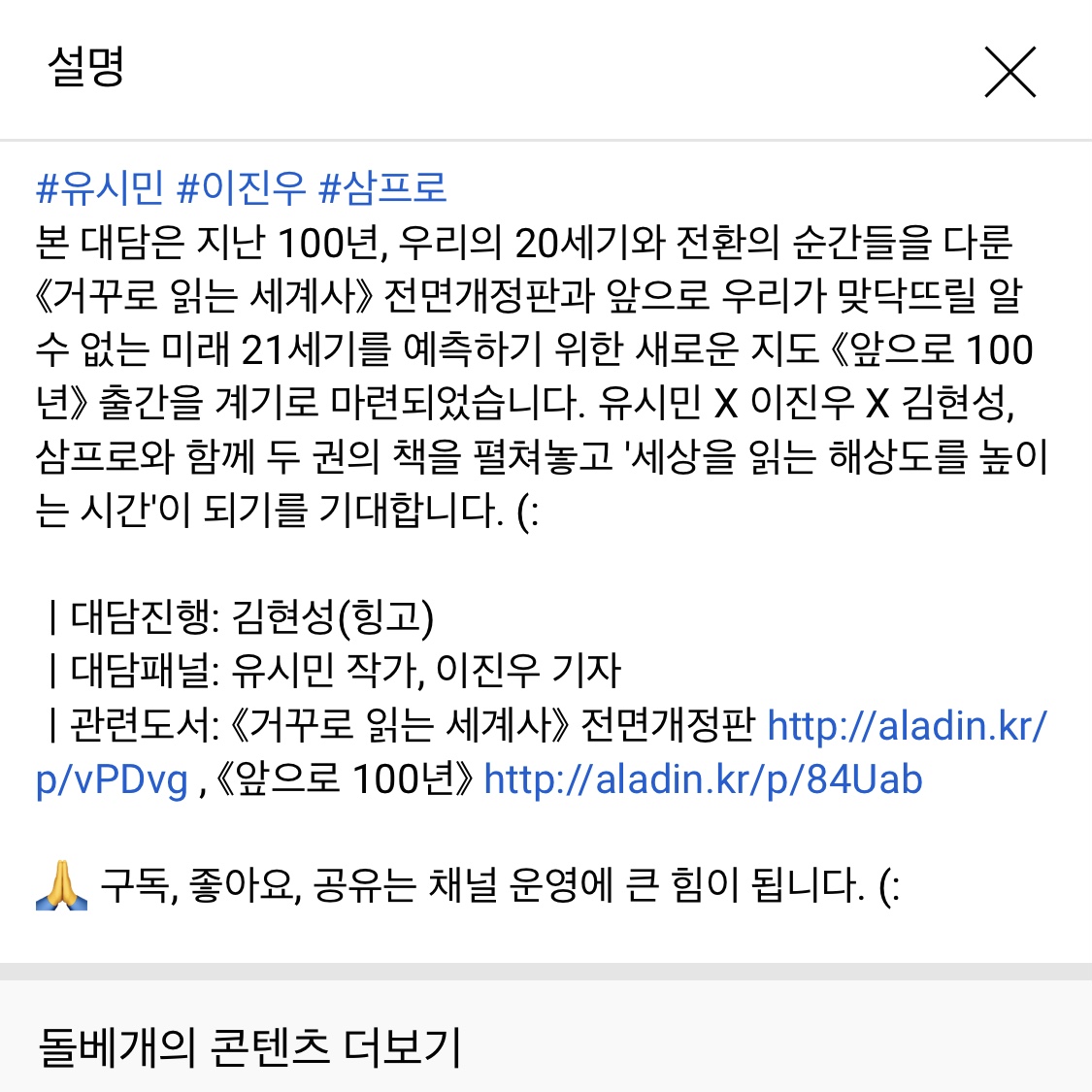 2022 알라딘 신년 특별 대담, 지난 100년 앞으로 100년은 무려 100분이 넘는 엄청난 분량을 자랑한다. 2022년 2월 4일 현재 조회수 64만회, 공개된 지 3주가 지났는데 이 정도 조회수는 어느 정도 선방했다고 생각한다.