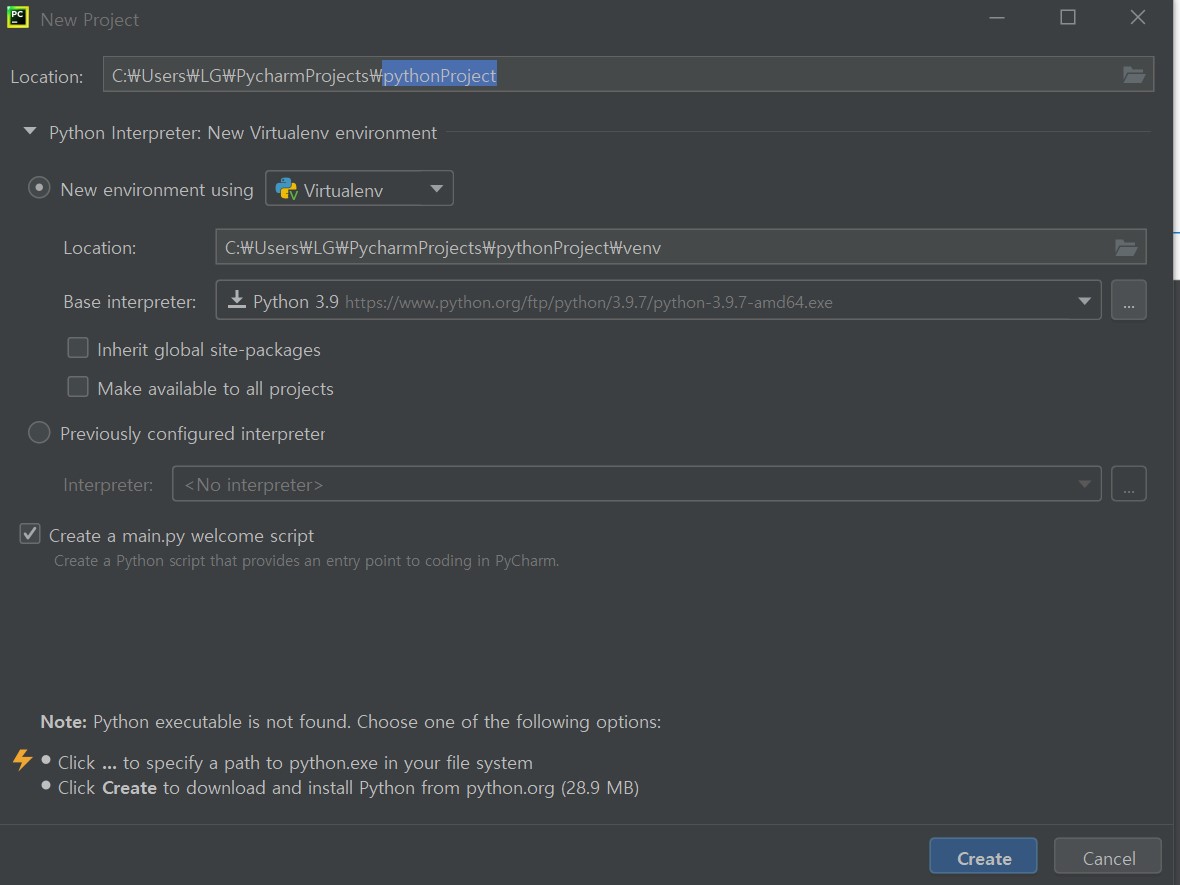 - 파이썬이 현재 설치되어 있지 않기에 파이썬 홈페이지의 파이썬 3.9가 기본으로 설정되어 있습니다.