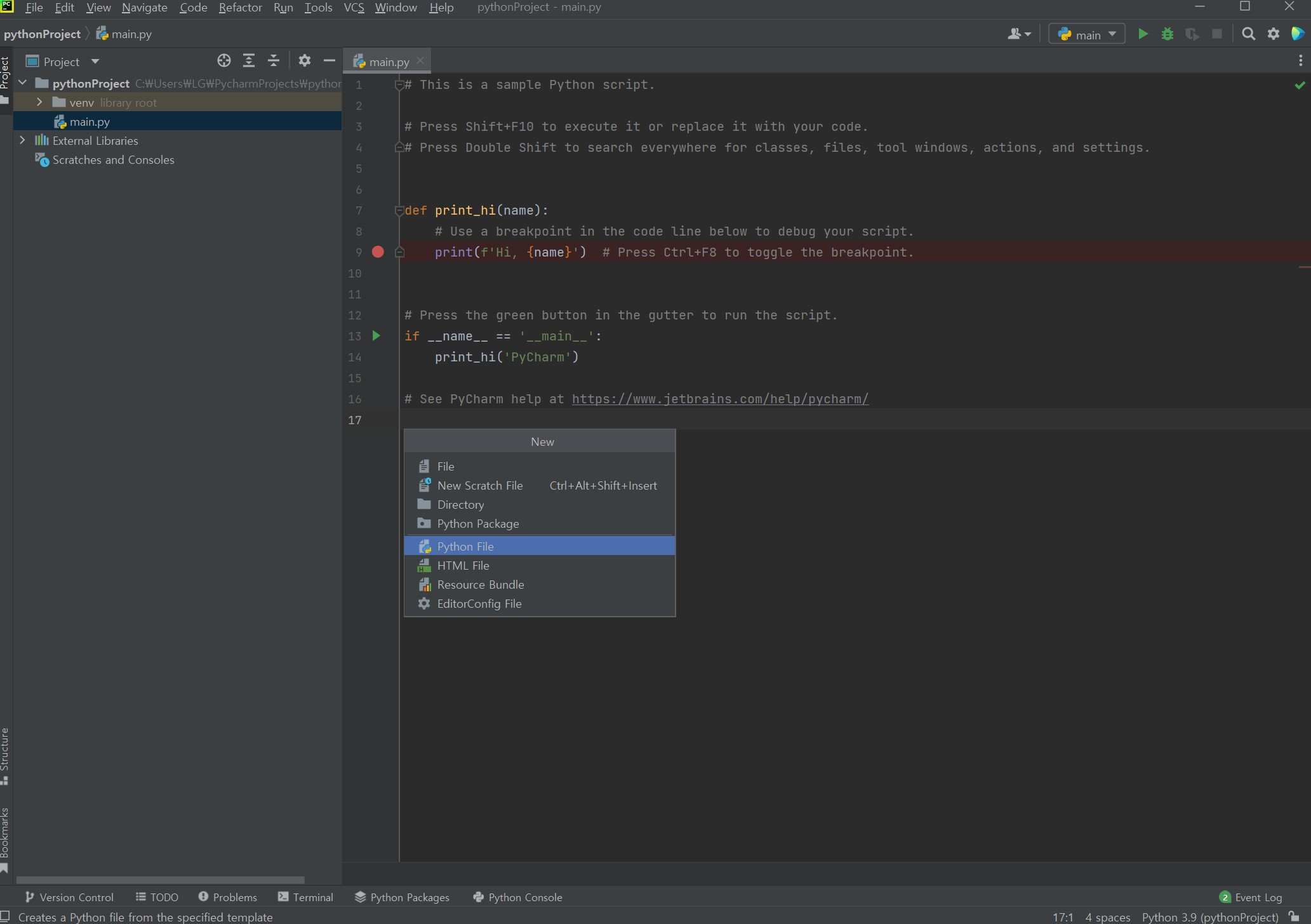 4. 파이참(PyCham) 실행 후 Hello World! 출력하기