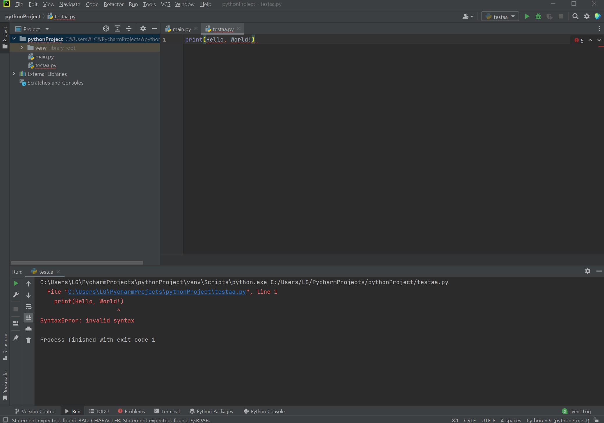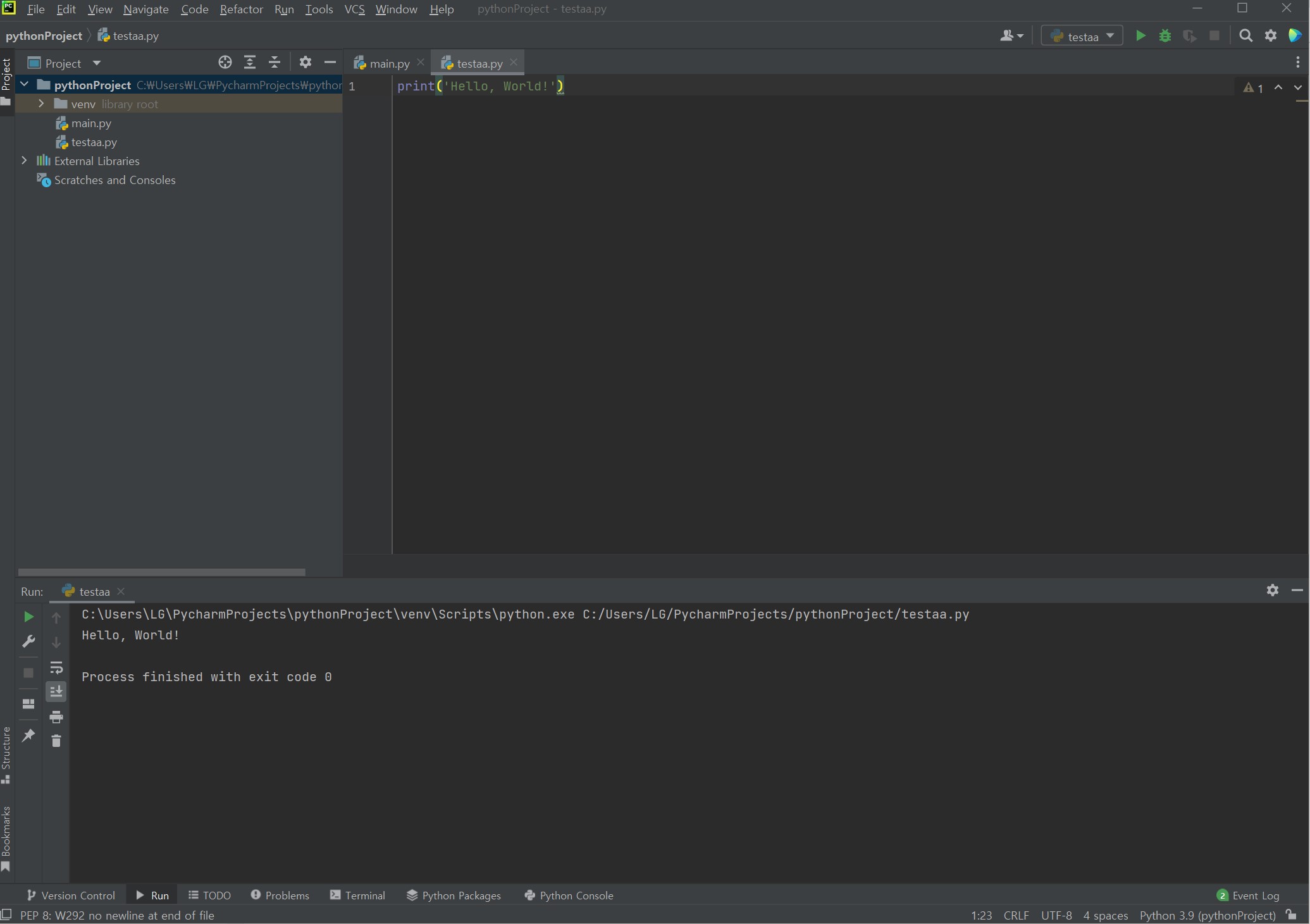 - testaa.py 파일을 생성하여 가장 기본 명령어인 print 명령어를 입력합니다.