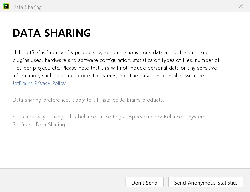 - 자료 공유 여부를 결정합니다. 프로그램 발전을 위해서 익명의 통계 자료를 보내기로 선택합니다.