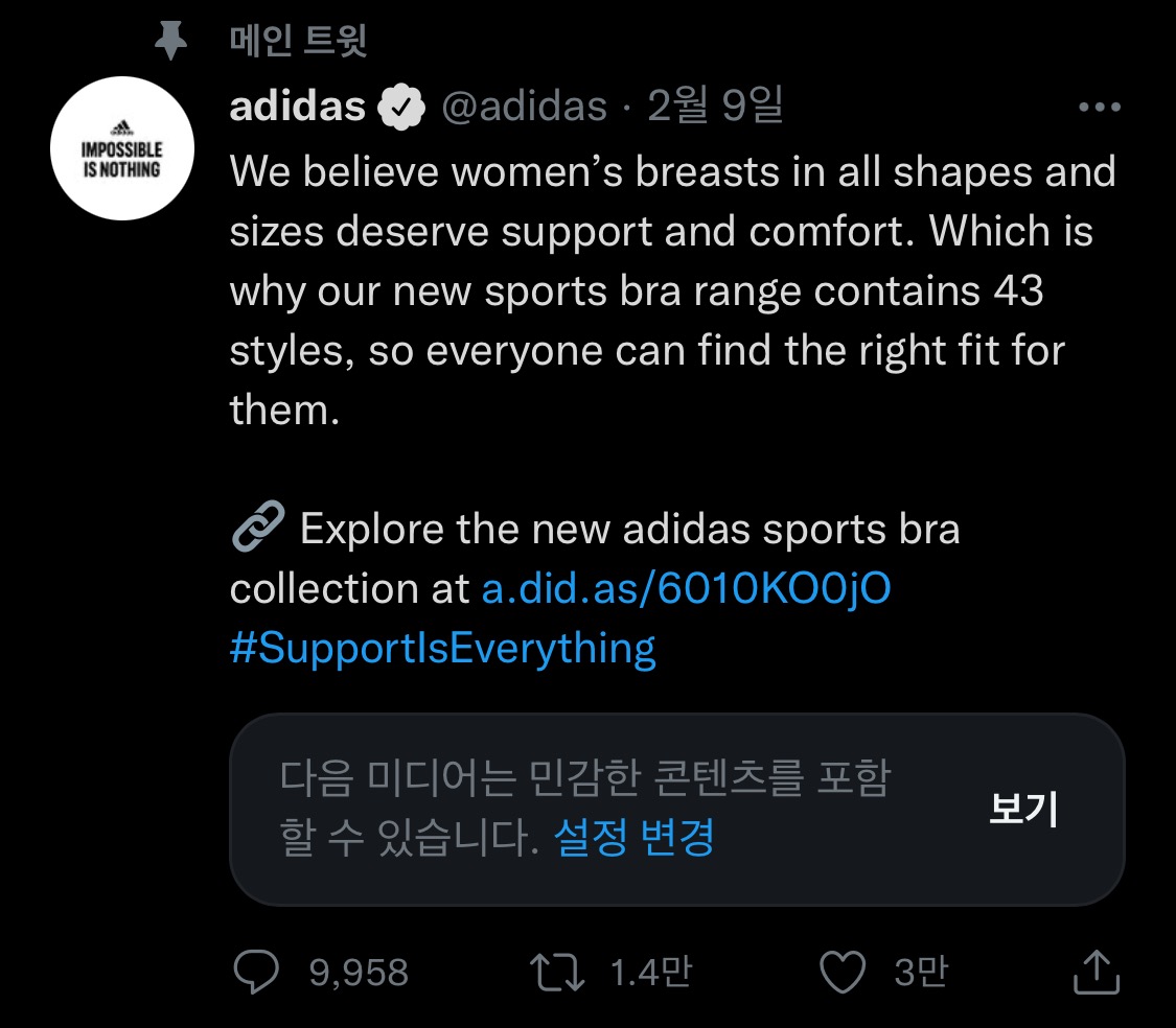 2022년 2월 9일 아디다스 공식 트위터 계정에 새로운 아디다스 스포츠 브라 콜렉션 광고가 올라왔다.