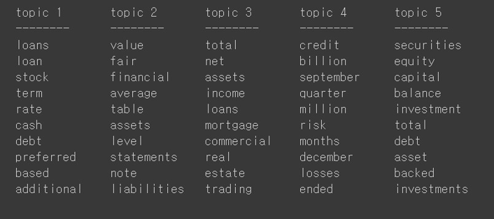 오늘 리뷰에서 마지막으로 살펴볼 예제는 NLP를 사용한 문서 요약 예제입니다. 금융 관련 문서를 자연어 처리를 통해서 핵심을 요약하여 요점을 빠르게 파악할 수 있도록 돕는 프로세스입니다. 사이킷런의 LDA로 문서 요약을 연습해보겠습니다.