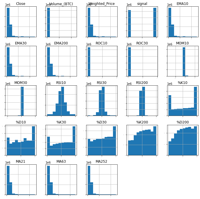 dataset.hist(sharex=False, sharey=False, xlabelsize=1, ylabelsize=1, figsize=(12,12))
