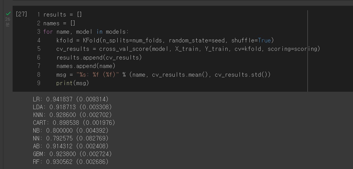 msg = "%s: %f (%f)" % (name, cv_results.mean(), cv_results.std())