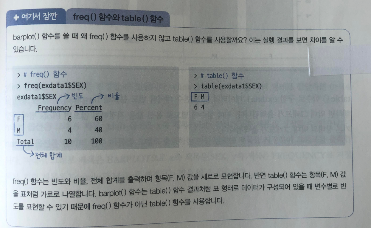 barplot() 함수를 쓸 때 왜 freq()함수를 사용하지 않고 table() 함수를 사용하는지 설명을 하고 있습니다. 이러한 이유를 설명함으로써 독자로 하여금 암기가 아니라 원리 이해를 바탕으로 어느 상황이든 적용할 수 있도록 독자의 실력을 꼼꼼하게 향상시켜줍니다.