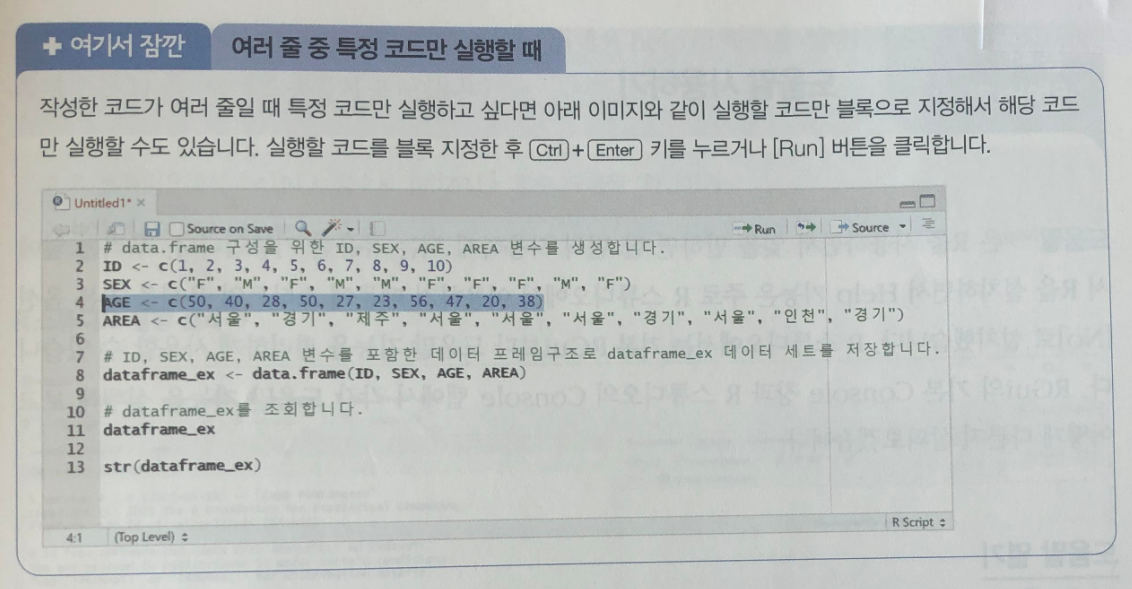 프로그래밍을 처음 다루는 독자들은 코드 실행 방법조차 모르는데, 그점을 놓치지 않고 컨트롤 + 엔터와 Run버튼을 모두 설명하고 있습니다. 또한 특정 코드 실행을 위한 블록 지정후 실행하는 방법도 세심하게 설명하고 있습니다.