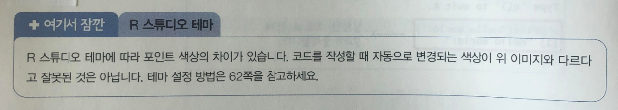 제가 프로그래밍을 처음 할 때도 당황했던 부분이기도 한데요. 왜 코드별로 색상이 책하고 다르지? 내가 잘못했나? 라는 생각으로 상당한 시간을 잡아먹었던 적이 있습니다. 어느 누구도 테마 차이라는 것을 말해주지 않았기 때문이죠. 그런 점을 놓치지 않고 “혼자 공부하는 R 데이터 분석”은 설명하고 있습니다.