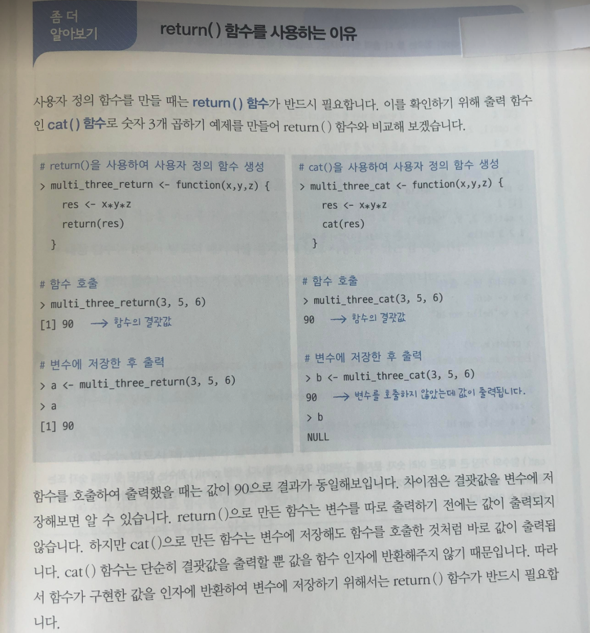 그런데 저자는 특정 함수를 사용하는 이유에 대해서 구체적으로 설명합니다. 위 이미지에서 보듯이 return()과 cat()의 차이를 설명하고, 어떤 상황에서 return()을 써야 하는지 언급하고 있습니다.