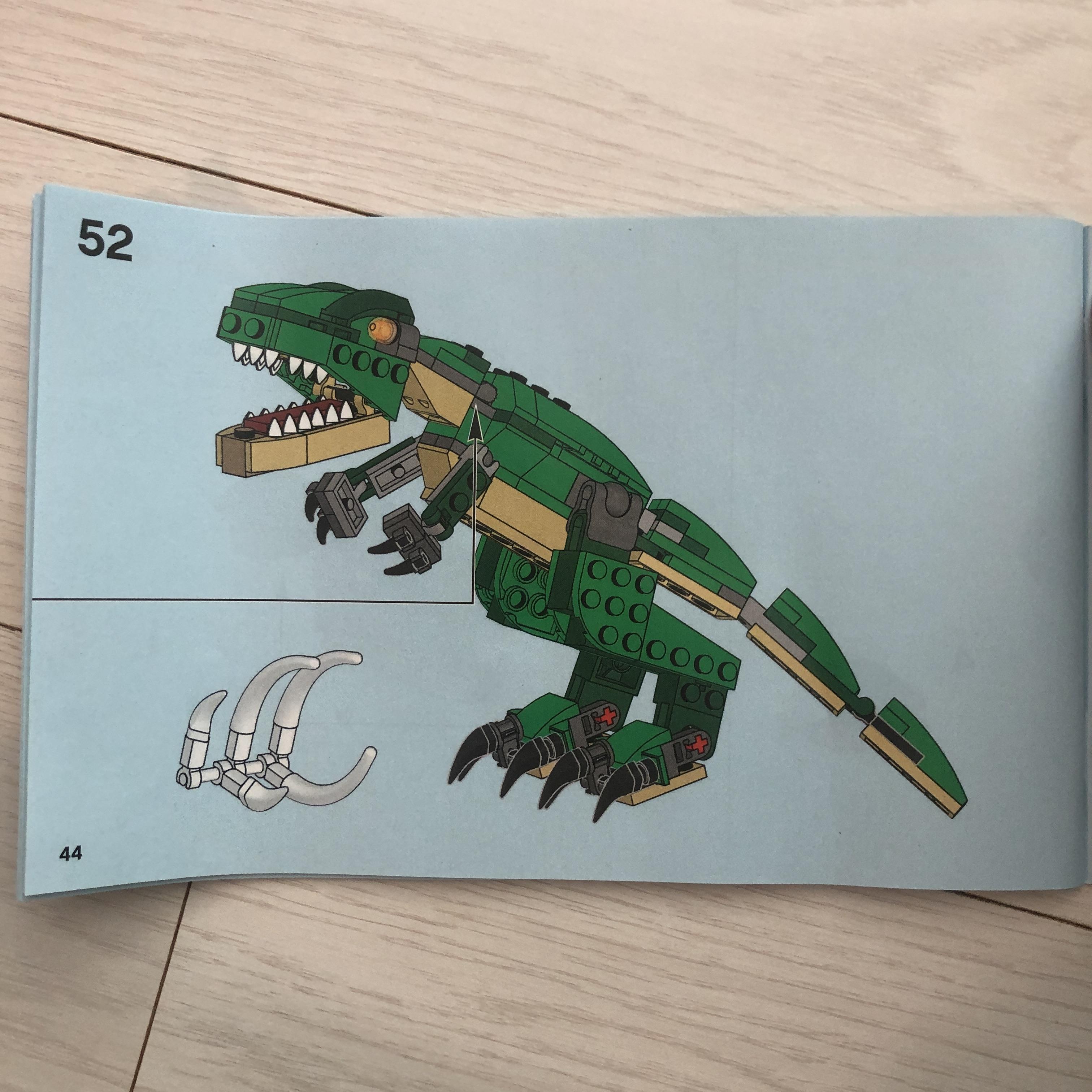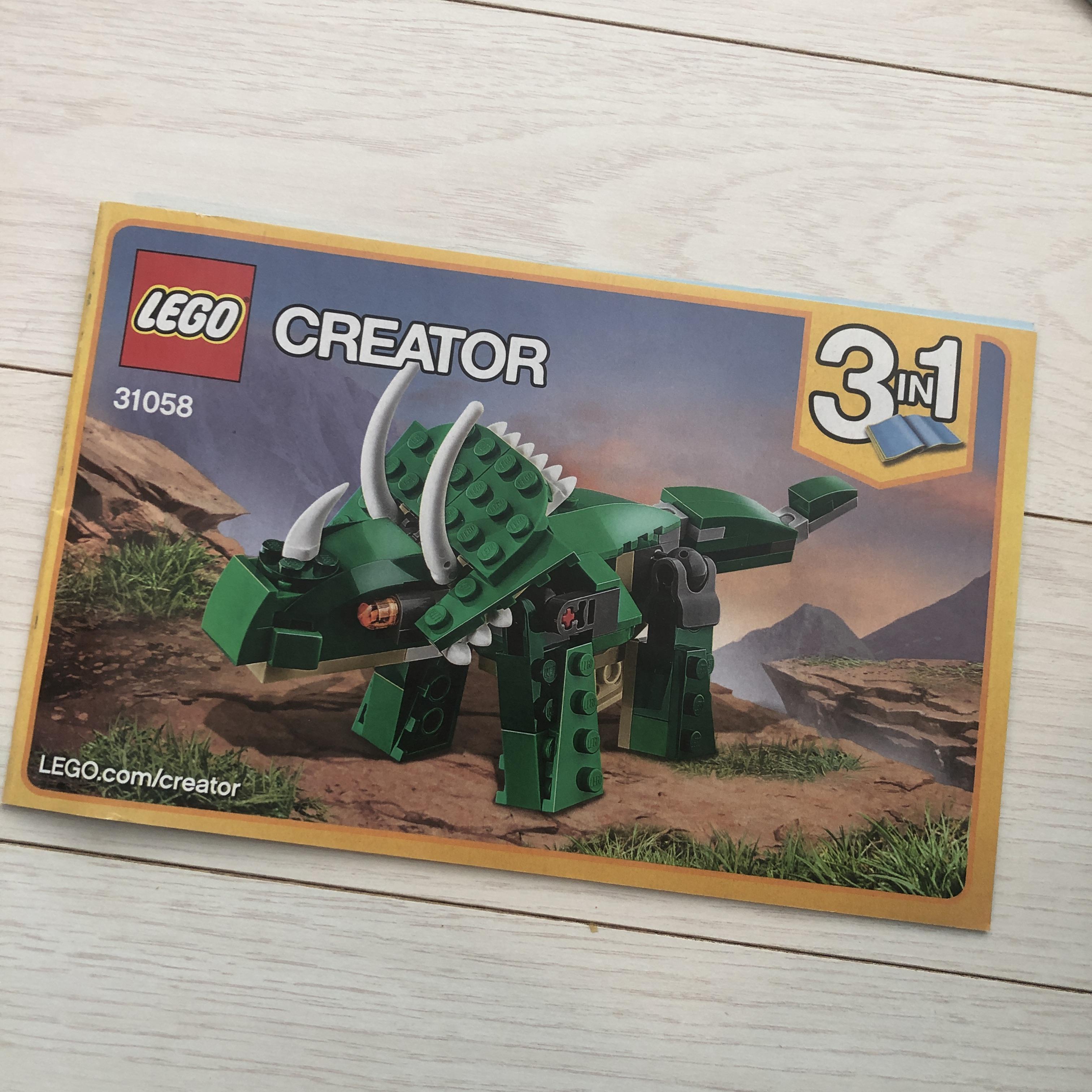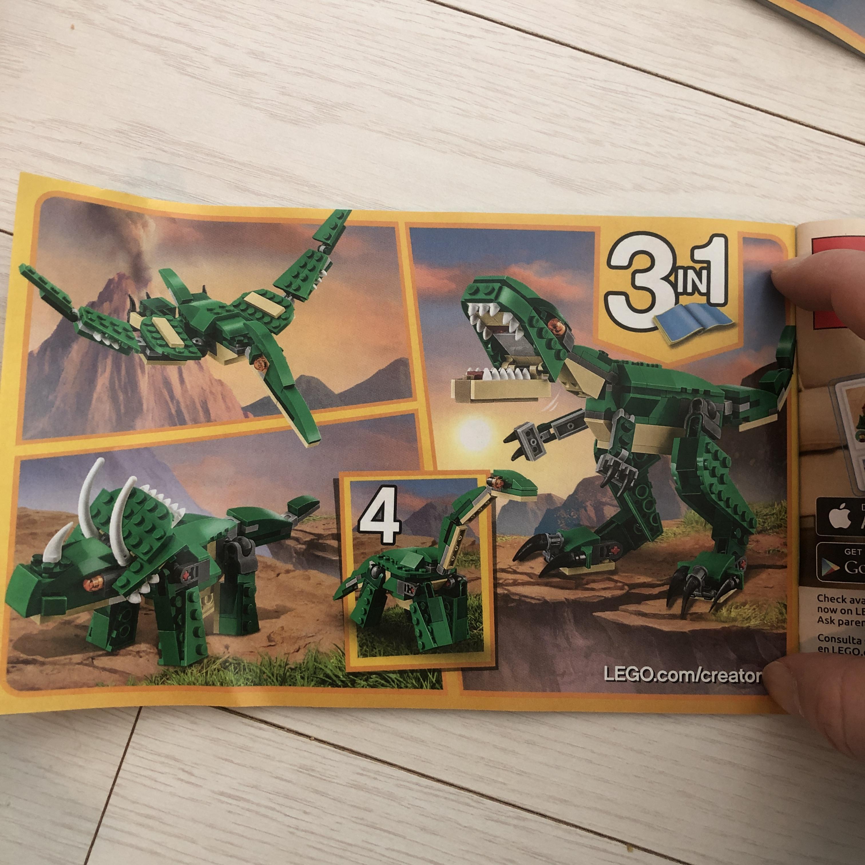 레고 크리에이터의 가장 큰 특징인 3 in 1 즉 3가지를 조립할 수 있습니다. 31058 힘센 공룡은 티라노사우르스와 트리케라톱스 그리고 익룡으로 조립할 수 있습니다. 그리고 히든 케이스로 브라키오사우르스가 있는데, 그건 조립 매뉴얼이 없습니다. 인터넷을 찾거나, 아이가 스스로 응용을 해야 합니다.