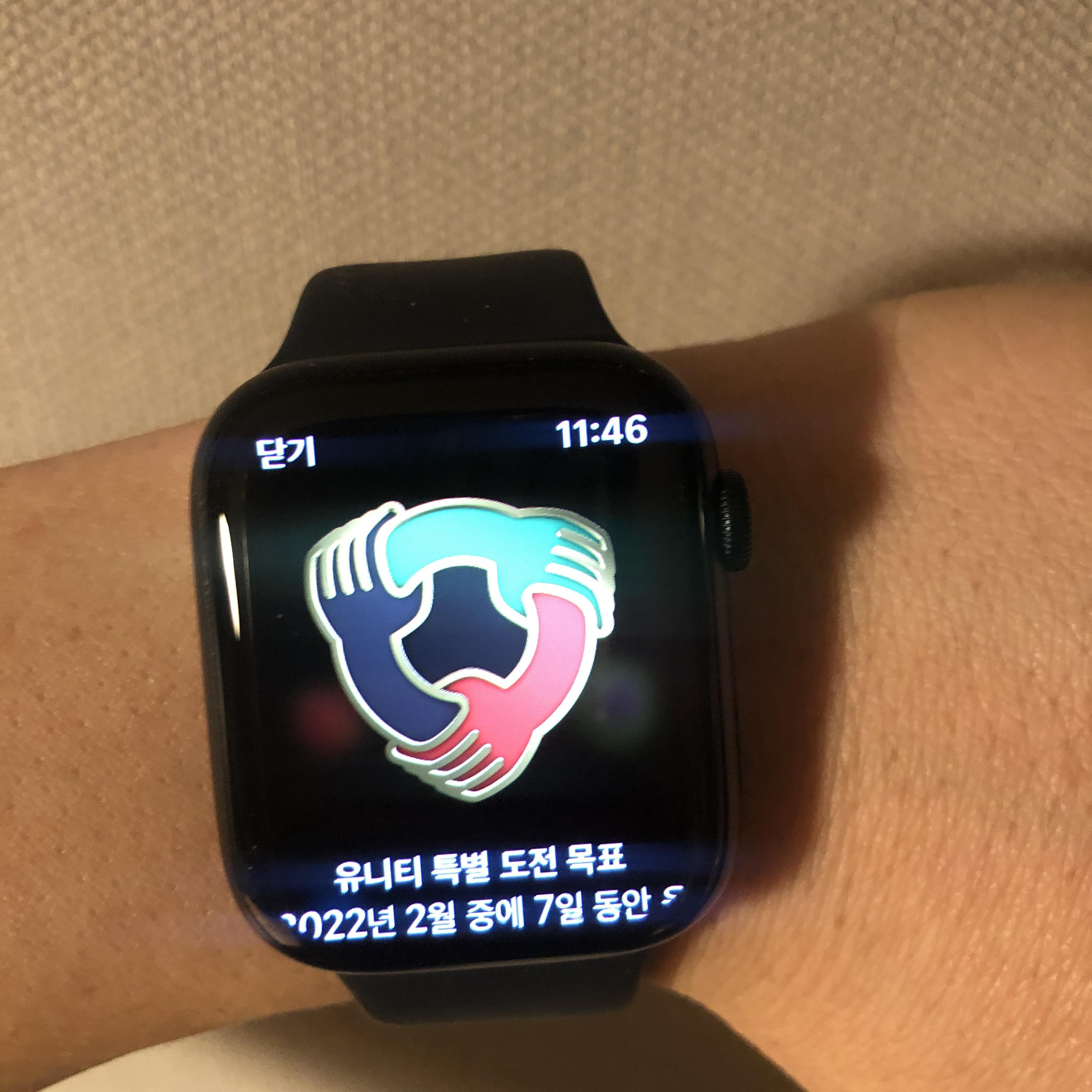 2022년 2월에 움직이기 링을 7일동안 달성하면 받는 배지다. 손 세개가 서로 맞잡는 이 배지는 흑인의 날(?정확한 명칭은 맞는지 모르겠지만)을 기념하는 특별 배지다.