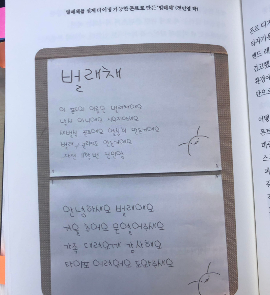 아래아한글에는 필기체가 있습니다. 그 필기체의 탄생 기원을 엿볼 수 있는 글인데요. 사실은 90년대 인터넷 커뮤니티에 작성된 글을 작가가 아카이빙 차원에서 수록한 글입니다. 온라인의 글이 활자화되었을 때 느껴지는 오묘한 감정은 이루 말로 설명하기는 어렵습니다. 실제로 인터넷에서도 글을 검색해서 읽을 수 있기에, 저도 여기에 전문을 싣습니다.