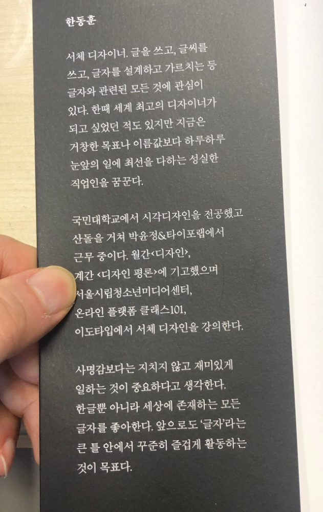 글자 속의 우주를 쓴 작가 한동훈은 국민대학교 시각디자인을 전공하고, 산돌커뮤니케이션을 거쳐서 지금은 박윤정&타이포랩에서 근무하고 있습니다. 폰트 관련 실무 경험이 꽤 긴 유능한 서체 디자이너인데요, 꾸준하게 월간 <디자인>과 계간 <디자인 평론> 그리고 윤디자인그룹의 월간 <theT>에 글을 썼습니다. 꾸준히 쓴 글 덕분에 가독성 좋은 글솜씨를 보여주는데요, 서체 디자인이라는 전문적인 영역을 일반 독자도 알기 쉽게 풀어쓰는 역량이 상당히 탁월합니다. 그뿐만이 아니라, 작가가 쓰고자 하는 주제와 관련된 시각자료 아카이빙에도 뛰어나서, 적절한 시각 매체 자료를 글과 함께 제시합니다. 저처럼 디자인 전공을 하지 않은 독자도 쉽게 이해할 수 있습니다.