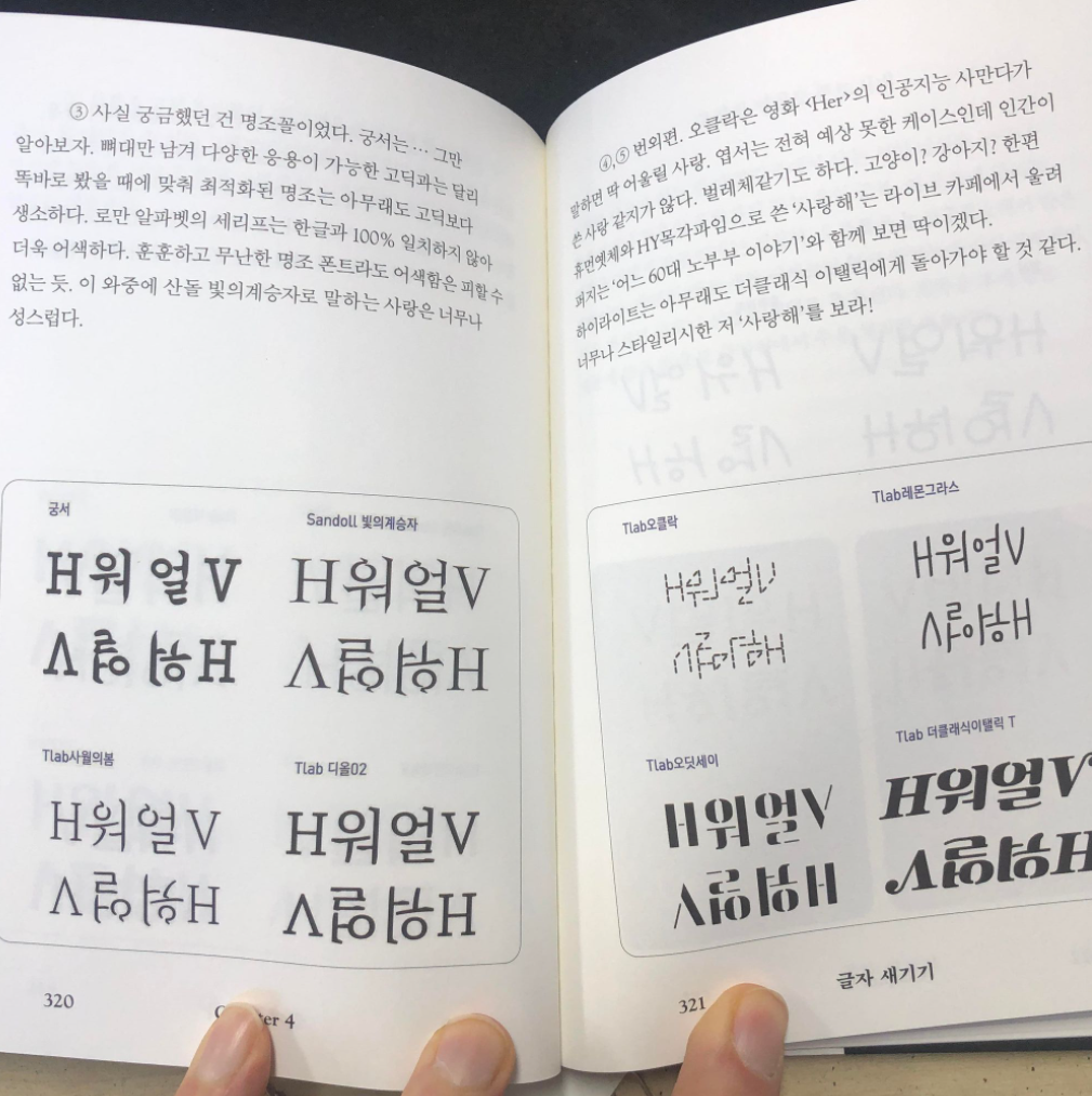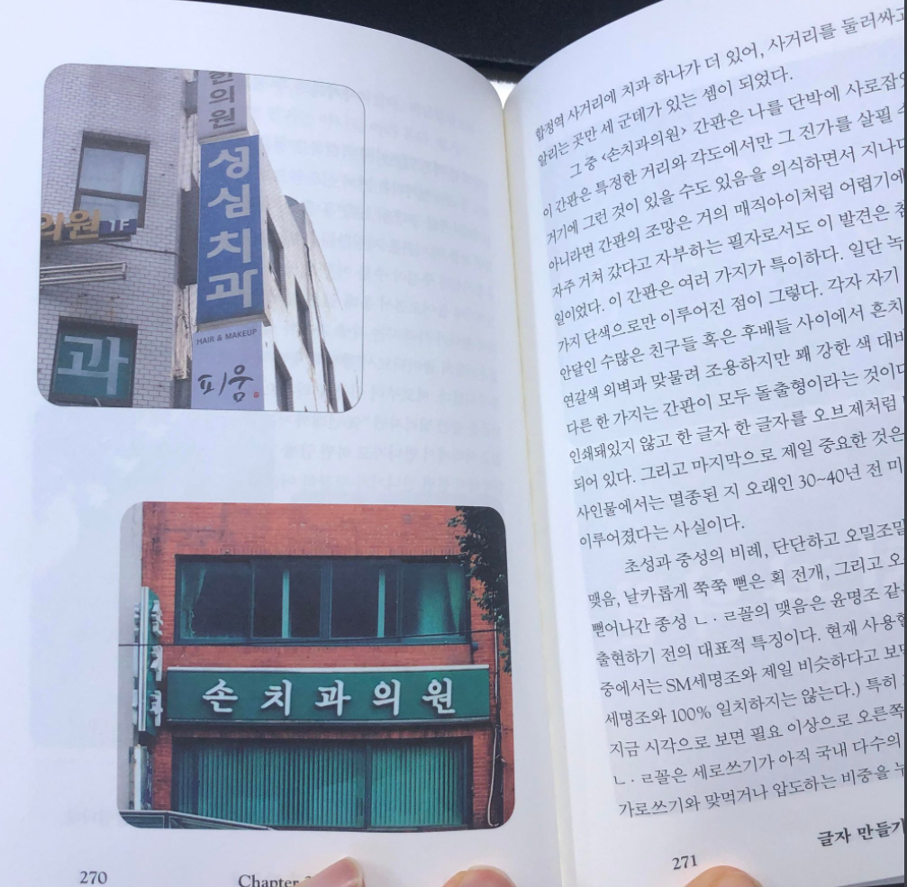 이렇게 17가지 글은 꼭 읽어보기를 권합니다. 우선 서체 디자인 관련 전문어를 알지 못해도 충분히 이해할 수 있는 평이한 글이면서 동시에 독자들도 일반적으로 자주 접할 수 있는 타이포그래피이면서도, 작가 한동훈이 바라보는 관점을 이해함으로써 어떻게 타이포그래피를 관찰해야 하는지 방법을 알 수 있습니다.