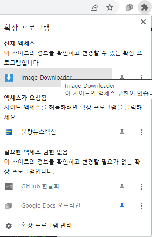 설치가 완료되면 크롬 우측 상단에 앱 버튼(확장 프로그램 실행 버튼)을 누르면 Image Downloader가 있음을 확인할 수 있습니다. Image Downloader를 눌러주세요.