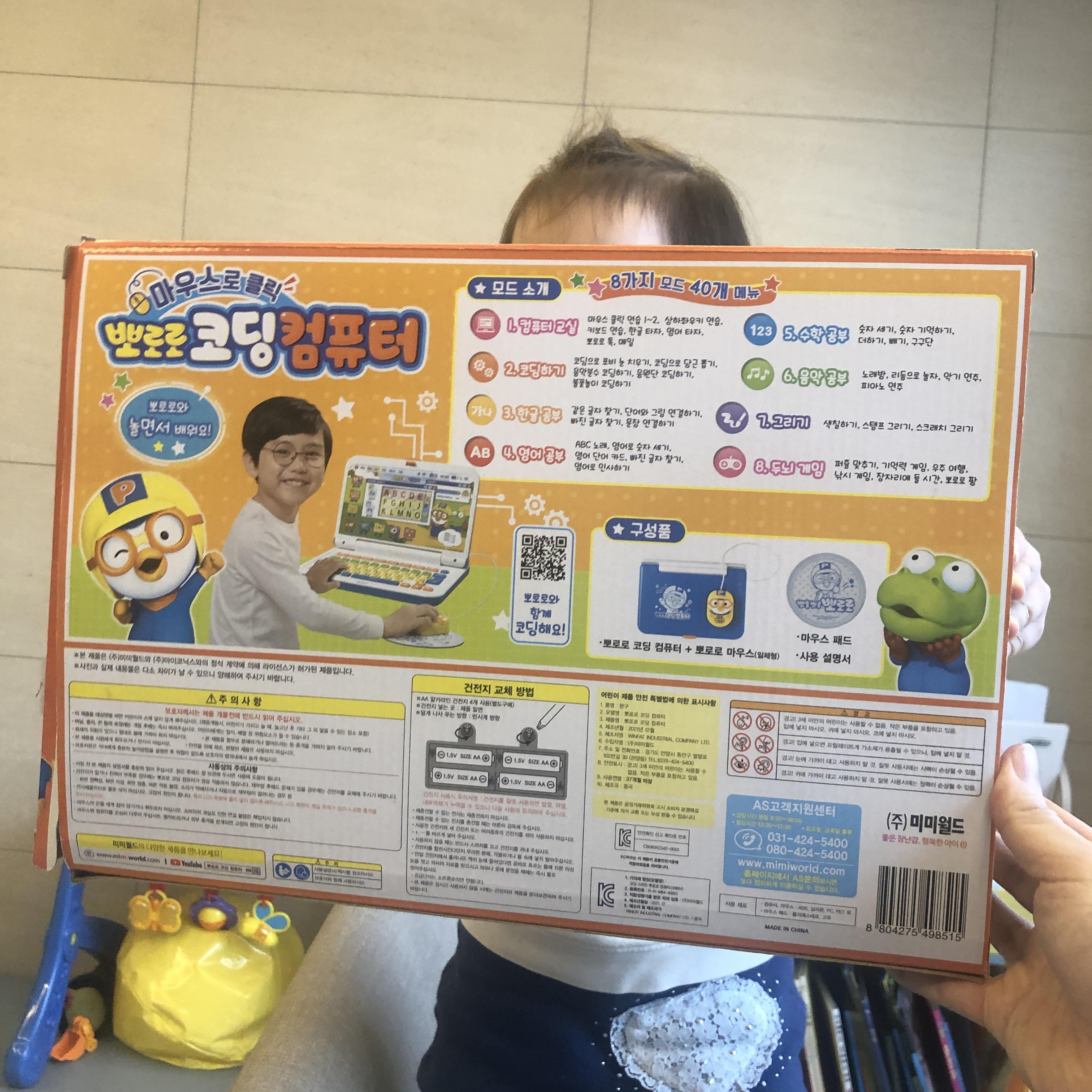 - 5-6살 아이가 뽀로로코딩컴퓨터와 친해지기 위한 선물 용도로 매우 적합하다고 생각합니다.