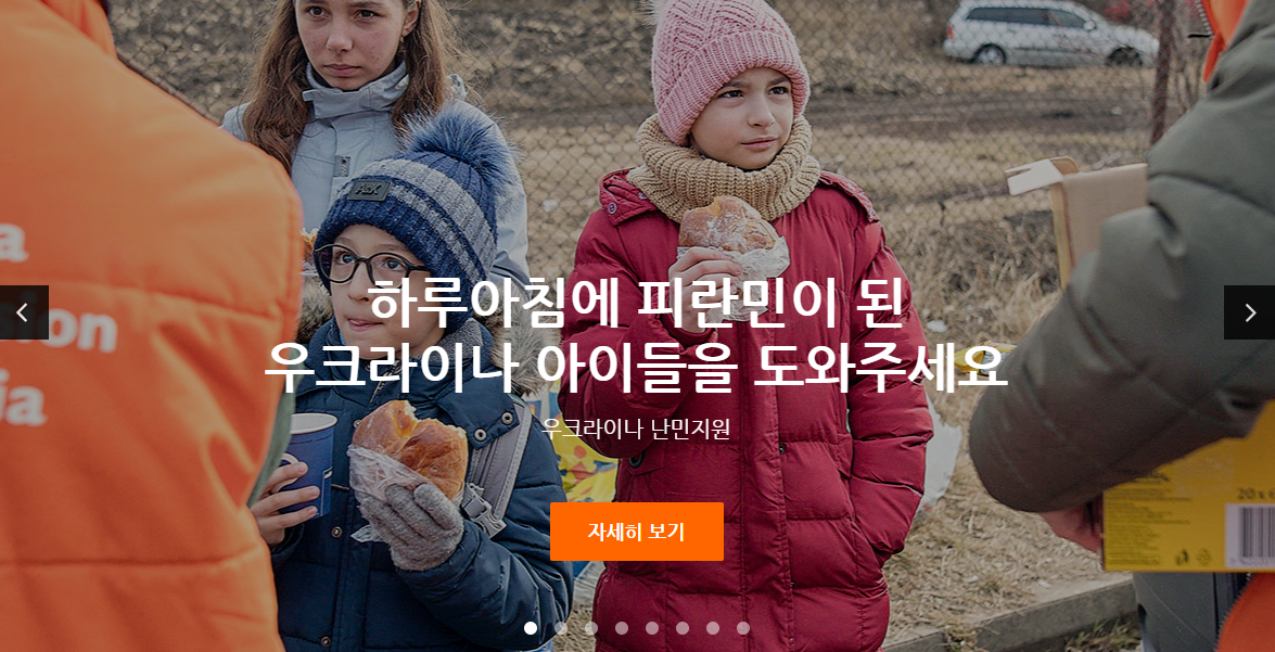 아니나 다를까, 월드비전 홈페이지에 접속을 하니 아래와 같이 메인 첫화면은 우크라이나 피란민을 위한 난민 지원 모급이었다.