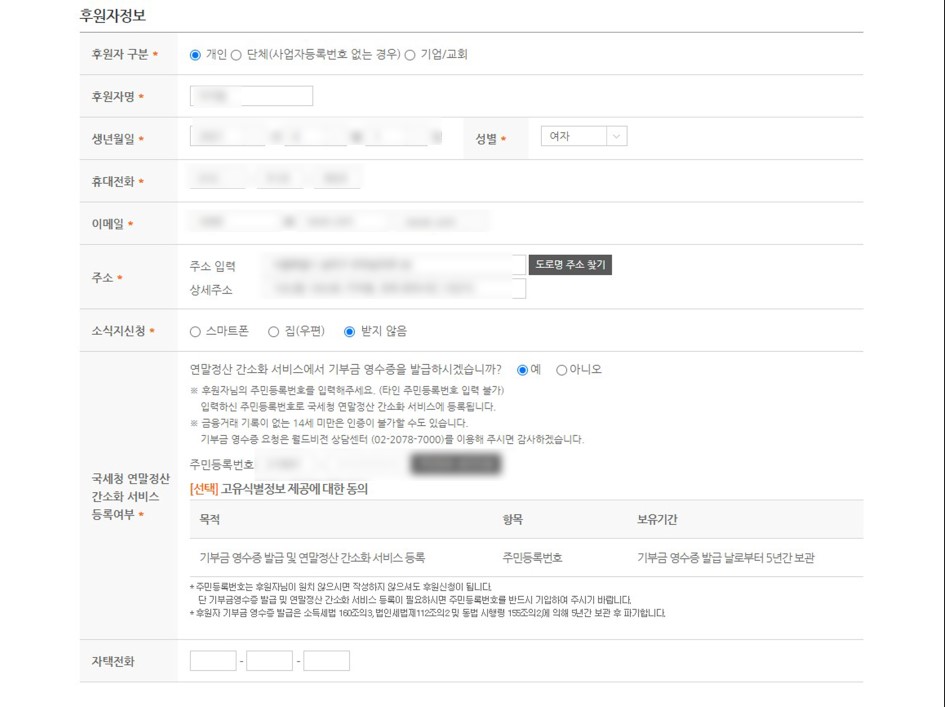 후원자 정보를 입력한다. 먼저 아이의 이름을 적고, 아이의 생년월일을 적었다. 휴대전화와 이메일은 부모의 것으로 했다. 국세청 연말정산 간소화 서비스에 등록을 하면 자동으로 연말정산에서 조회가 된다. 당연히 아이의 주민번호로 등록을 한다.