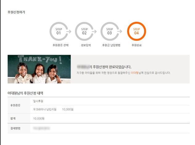 먼저 우리 삼남매 이름으로 각각 10,000원씩 총 30,000원이라는 소액을 후원하기로 했다. 금액은 많지 않지만 조금이라도 도움이 되었으면 한다.
