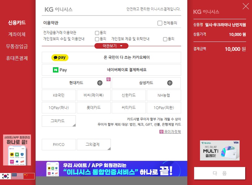 결제는 위처럼 카드로 가능하다. 대부분의 카드로 후원을 할 수 있다.