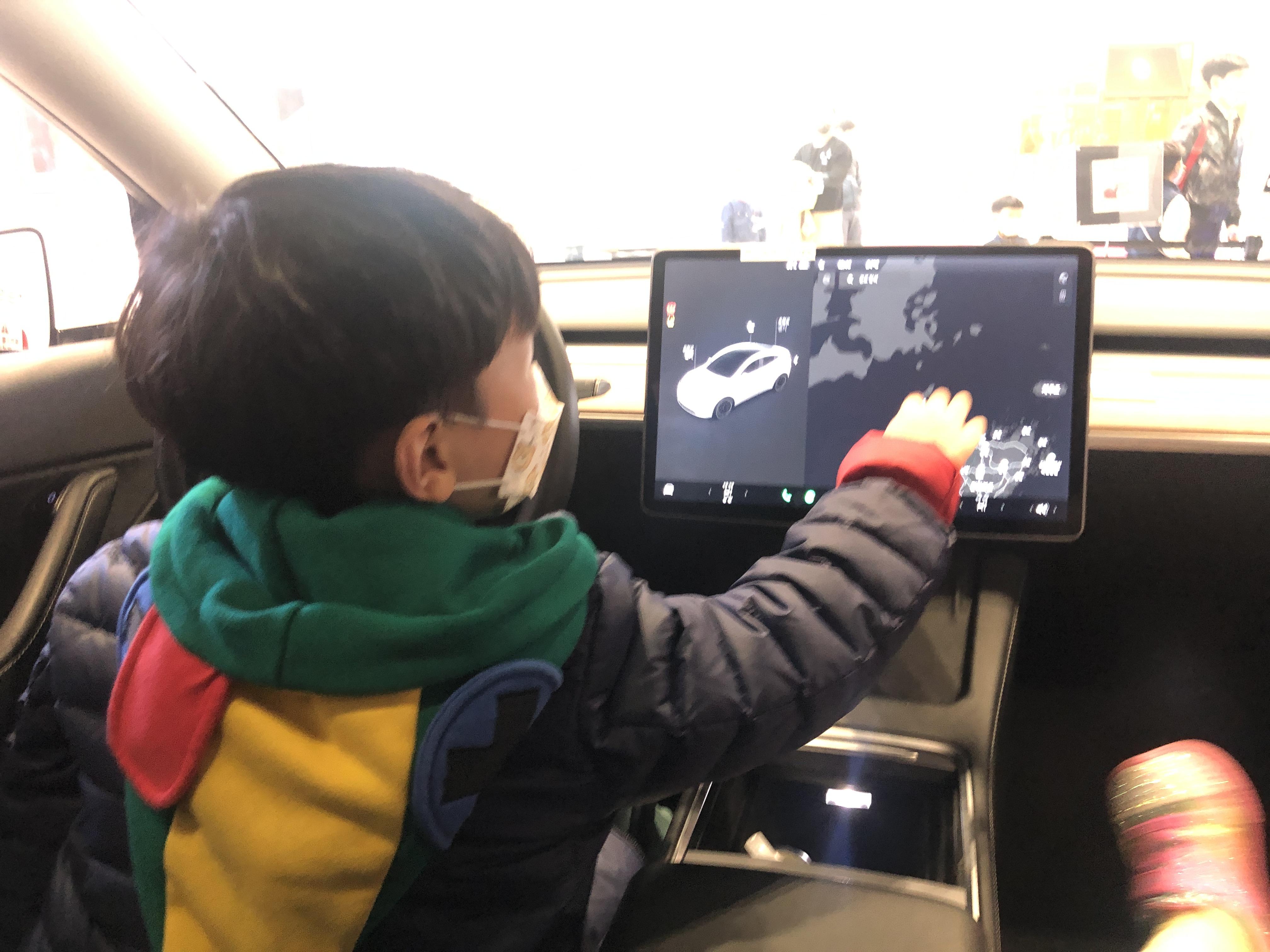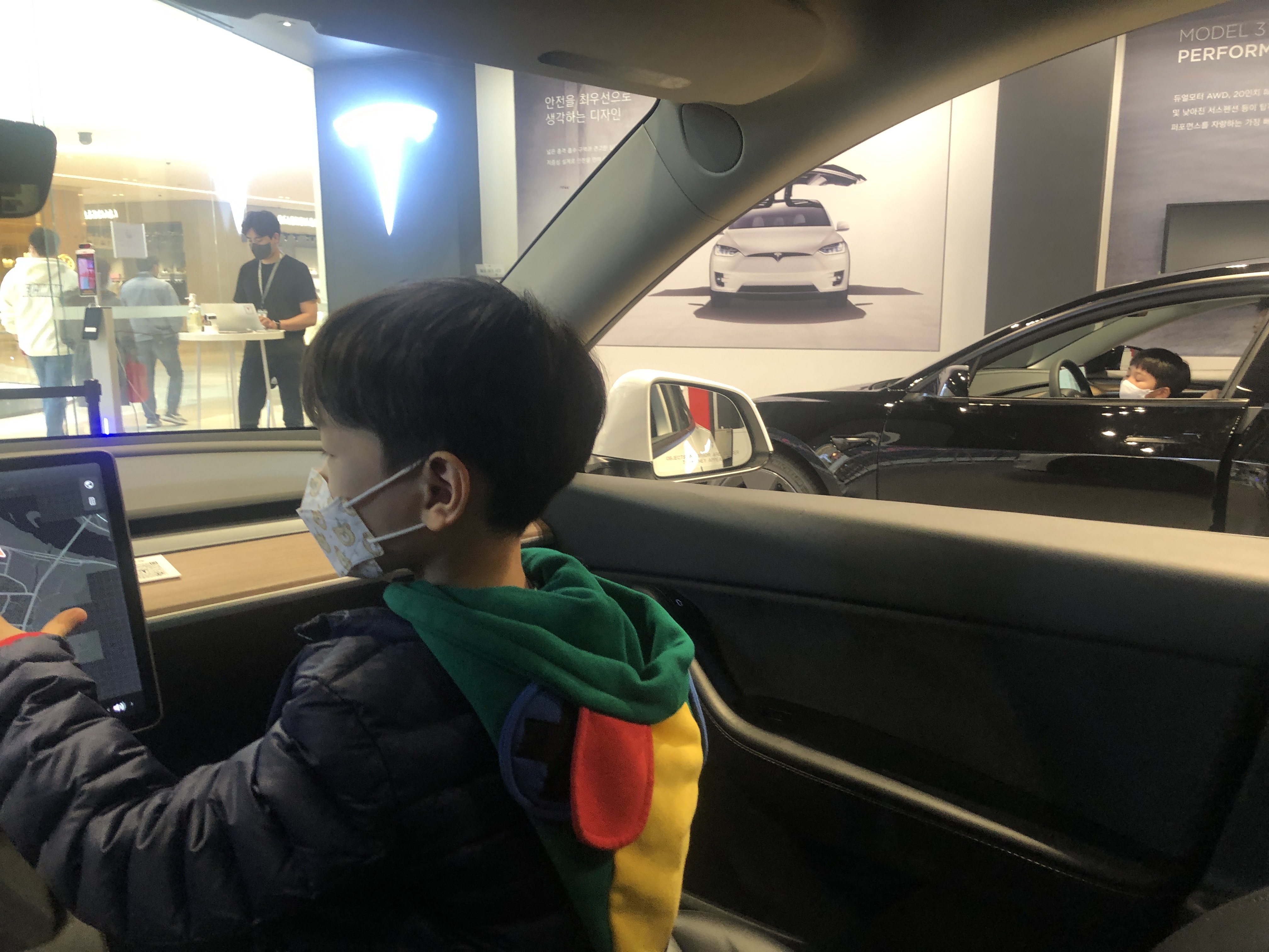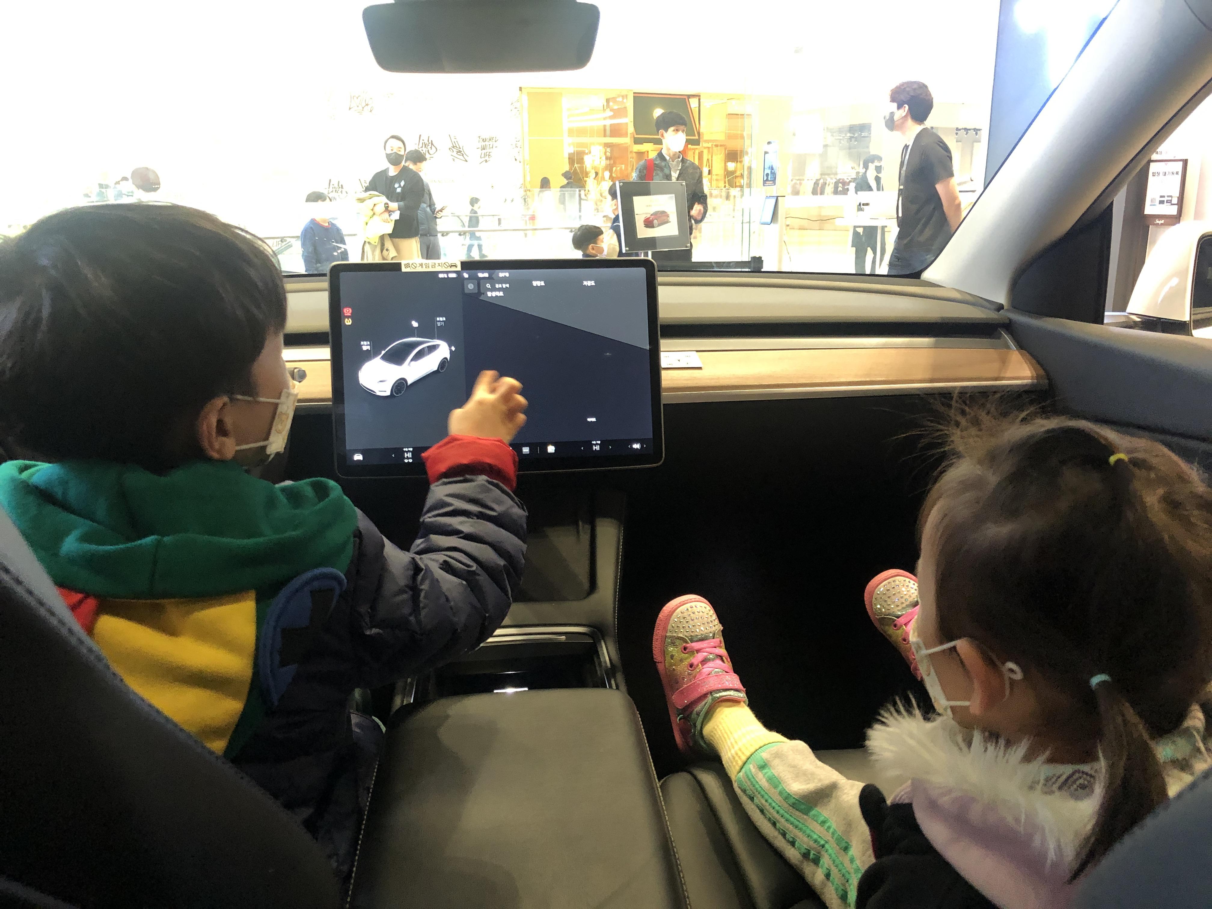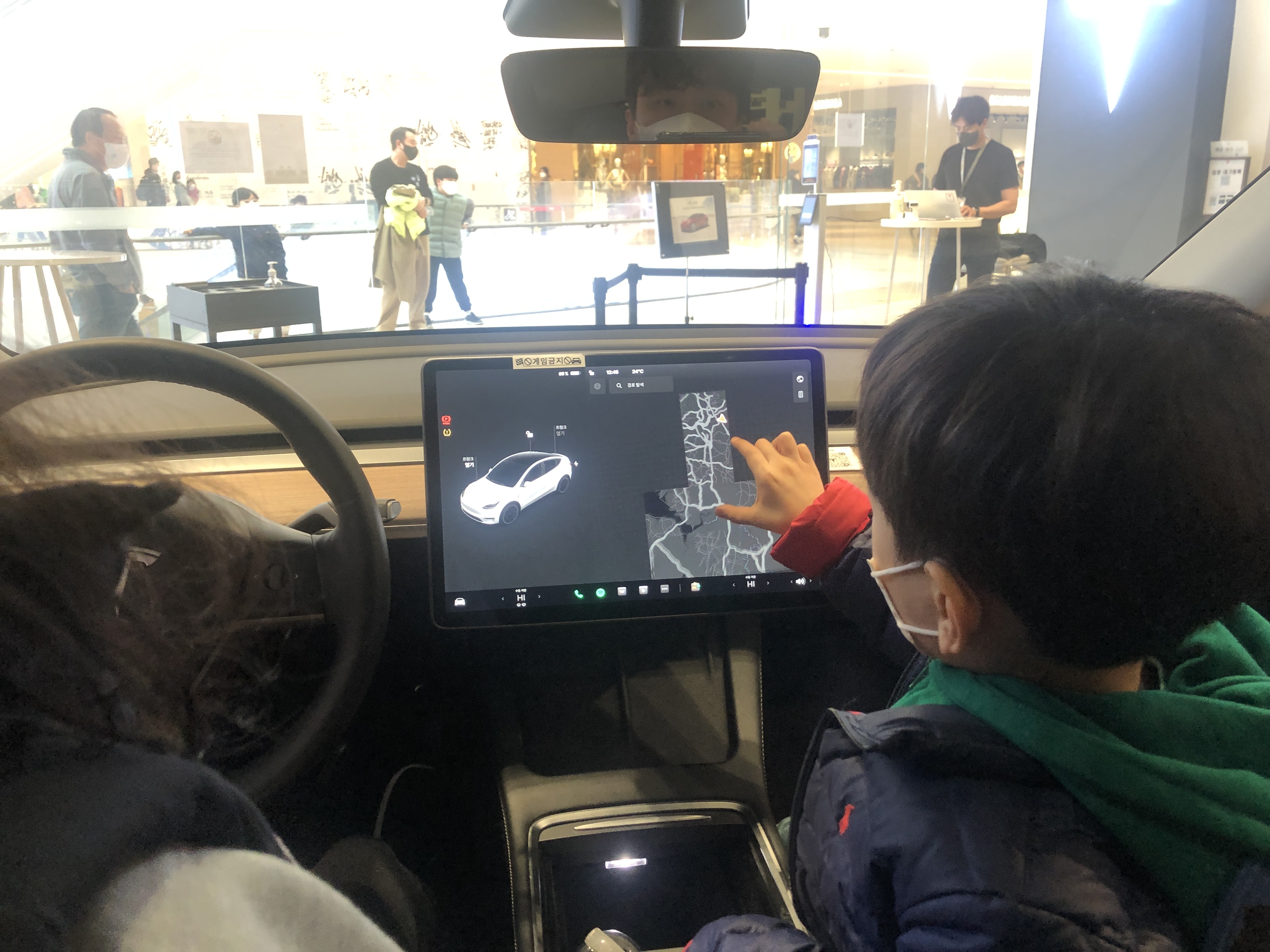 테슬라는 어른뿐 아니라 아이들에게도 매력적인 차다. 차에 탑승하자마자 8살 첫째가 마음껏 가지고 논다. 직관적인 인터페이스 덕분이다.