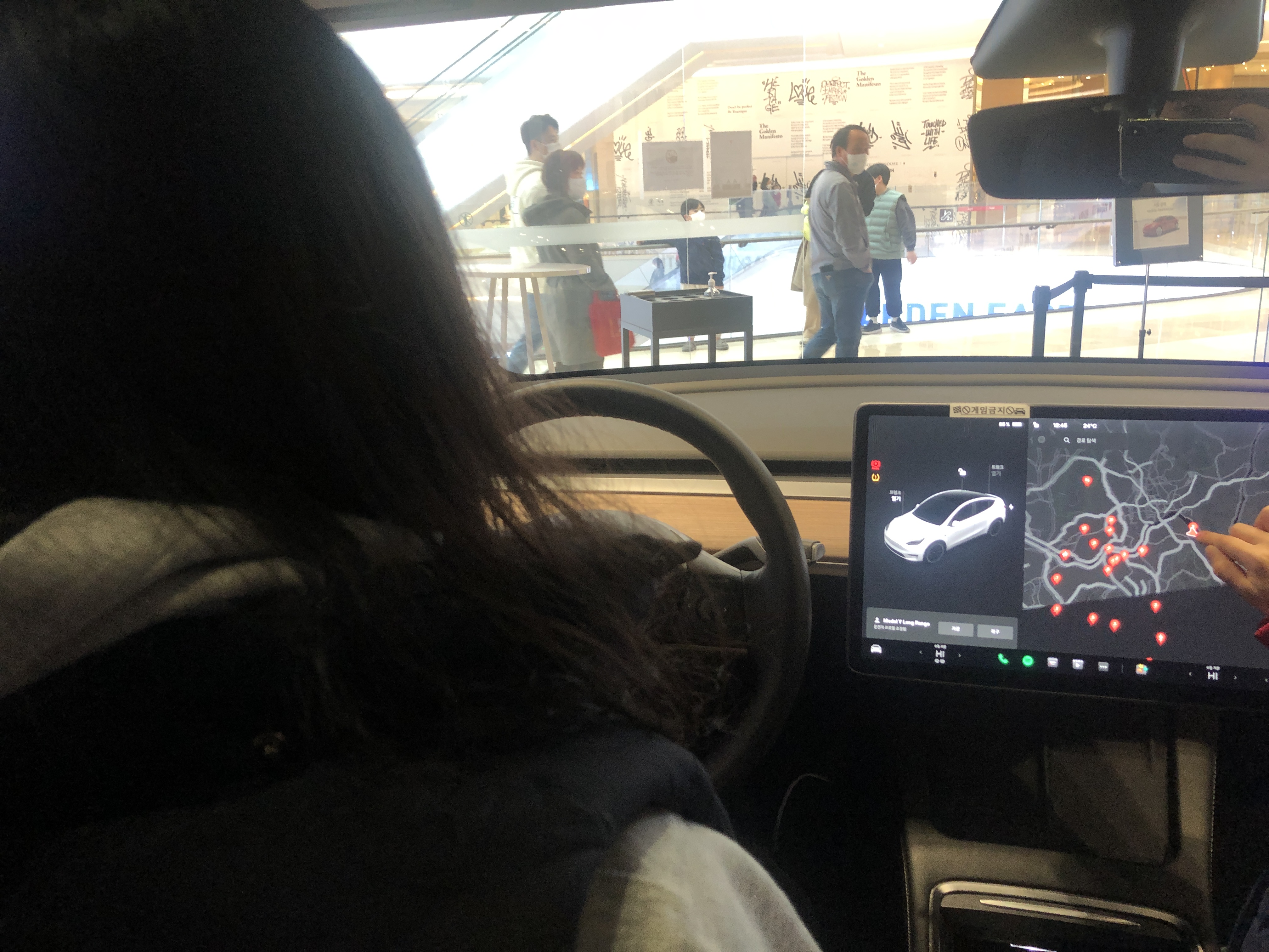 모델y를 구매하면 와이프가 운전할 것이기에, 운전석에 앉은 와이프. 내년에 복직 예정이라, 복직 선물로 사줄 모델y다. 셋째 출산 후 오랜 육아휴직으로 지친 와이프에게 최고의 선물이다.