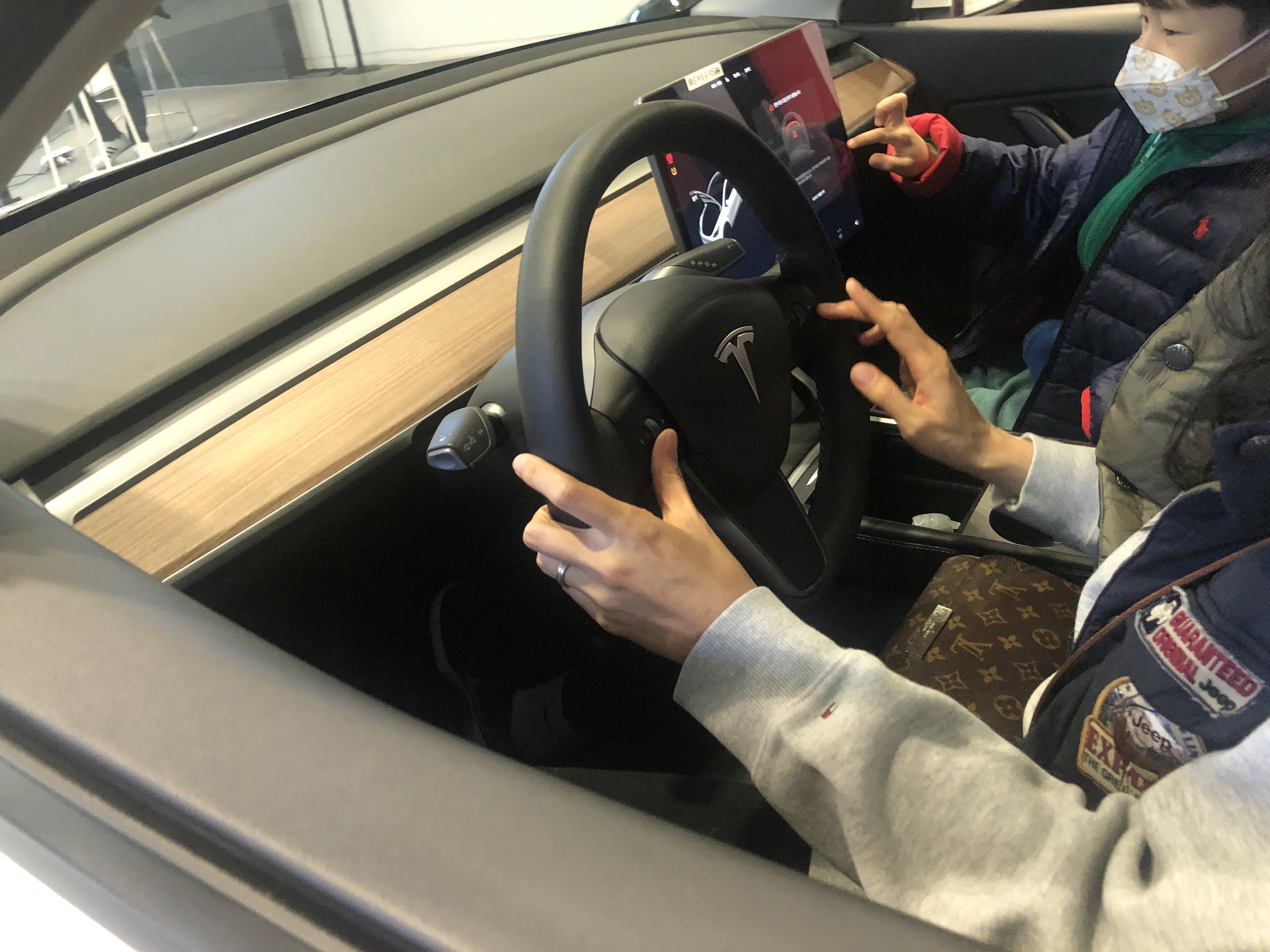 모델y 운전자 석에 앉아 마음껏 만져보는 첫째 아들.