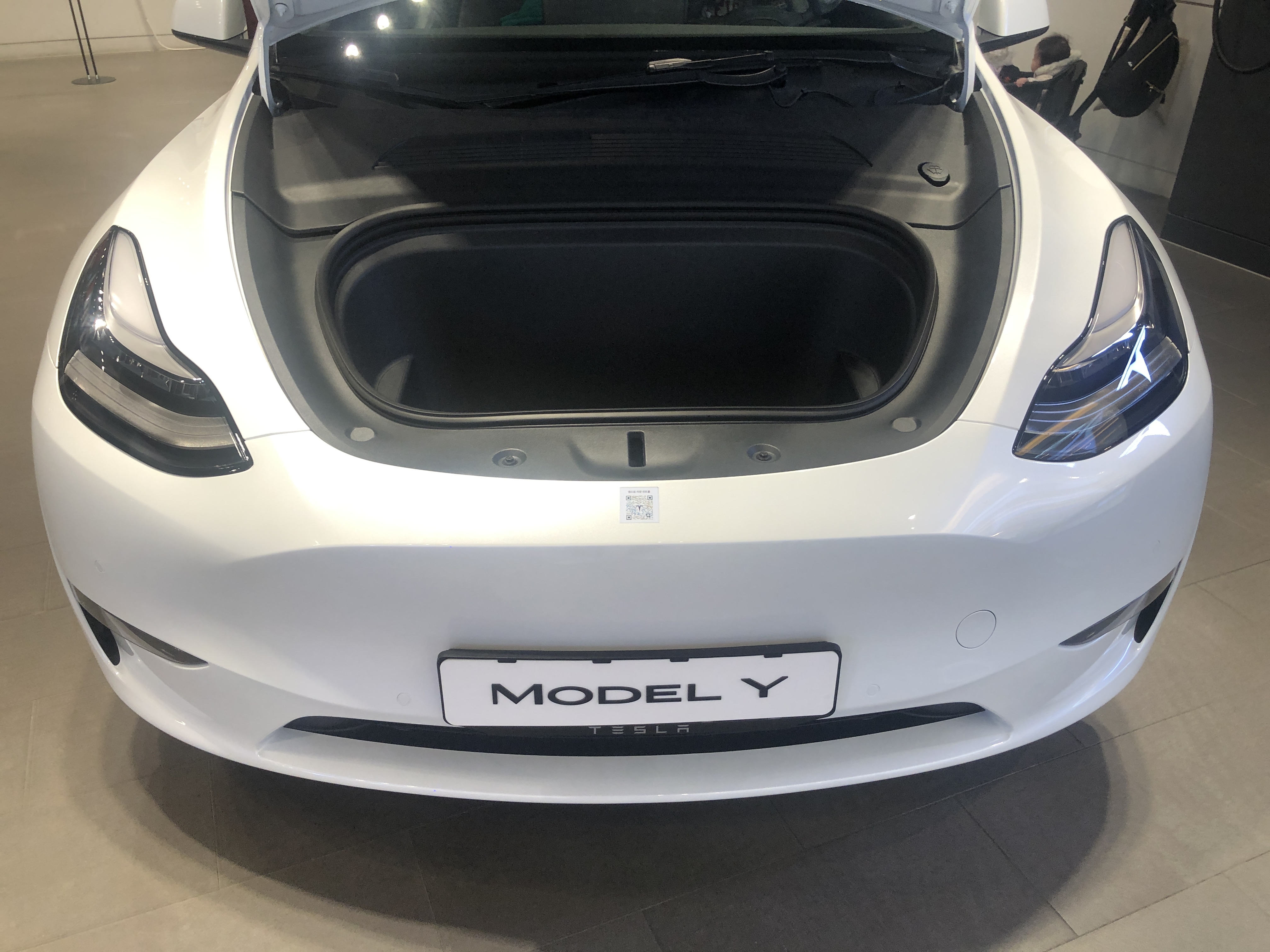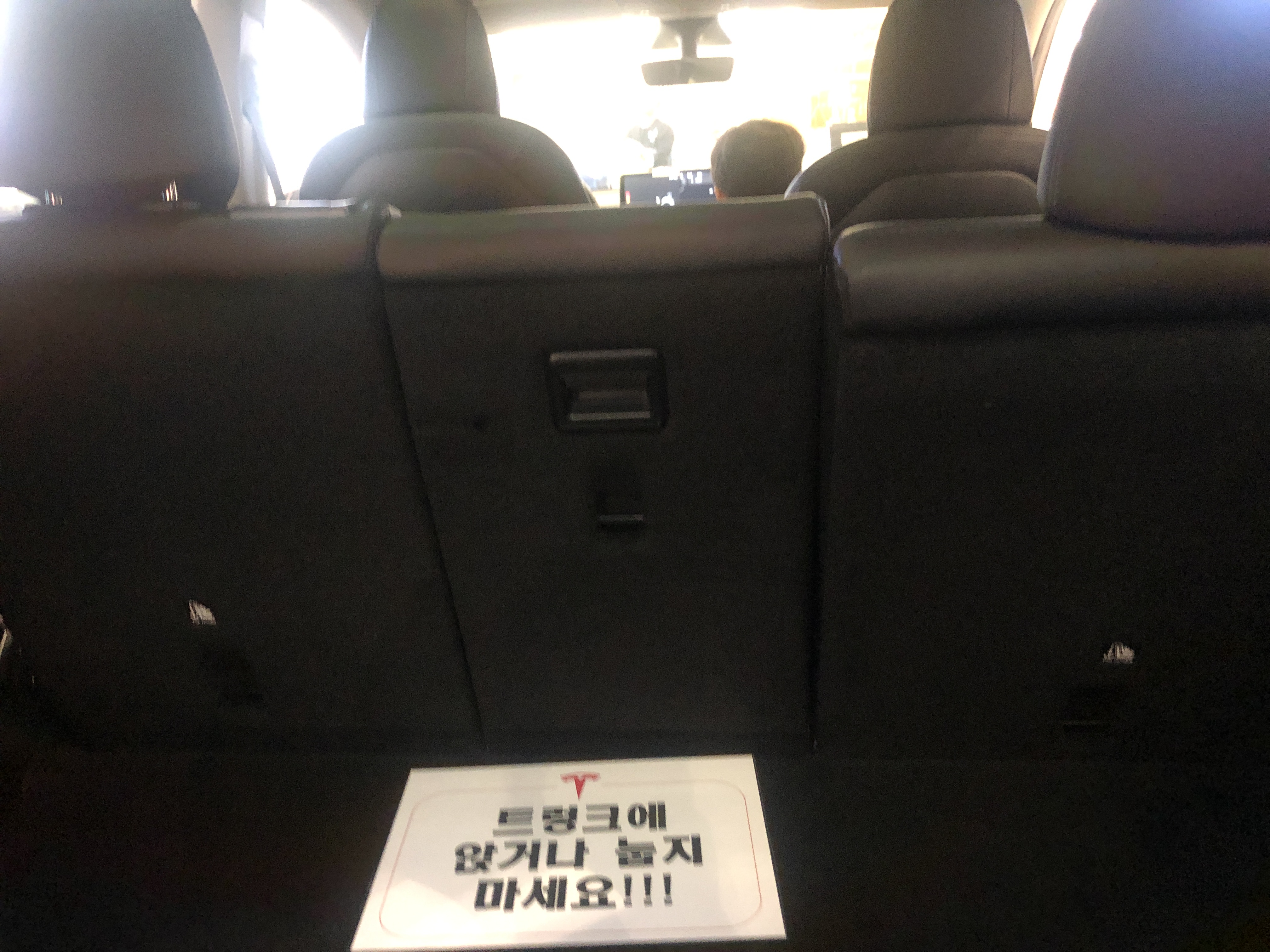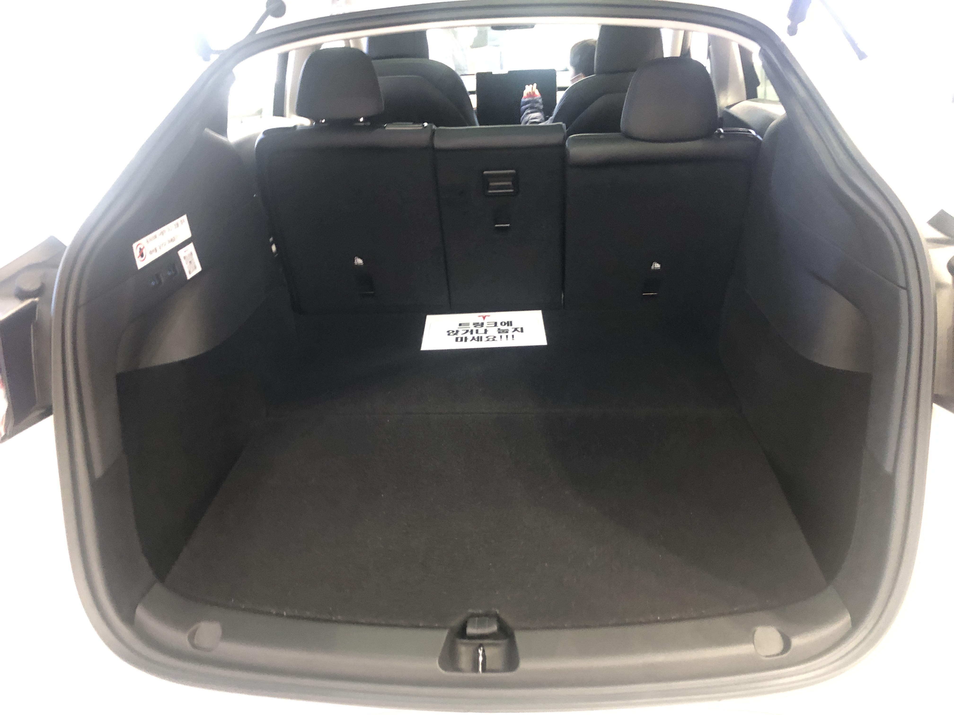 모델y 트렁크다. 생각보다 크다. 현재 우리집 차는 적재 공간이 넓은 쏘렌토인데, 큰 차이가 없다. 다만 모델y 차고가 약간 낮아서, 쏘렌토 트렁크 용량에 비해 약간 작다고 볼 수 있다.