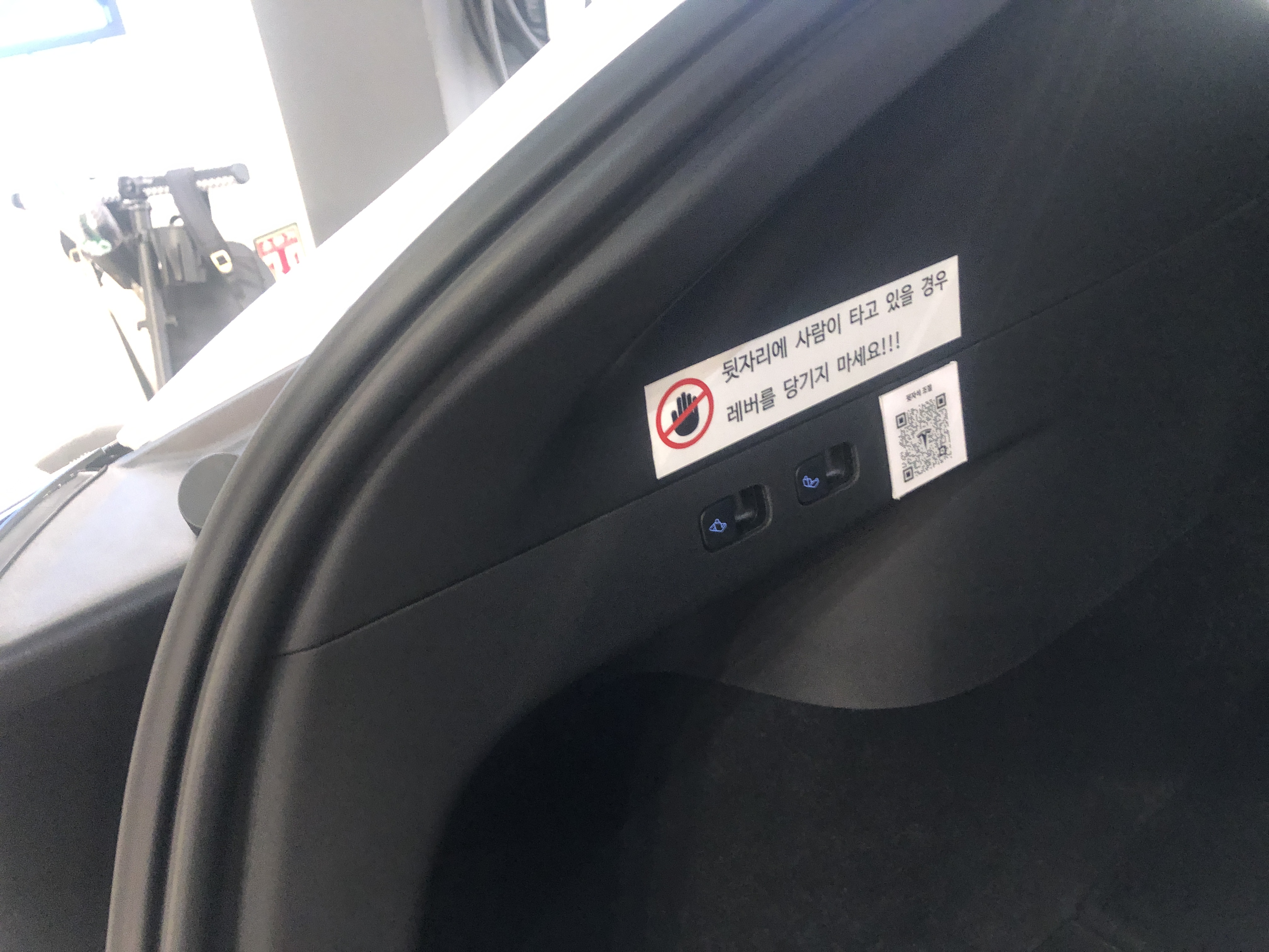 모델y 트렁크에는 뒷좌석을 한번에 접는 버튼이 있다.