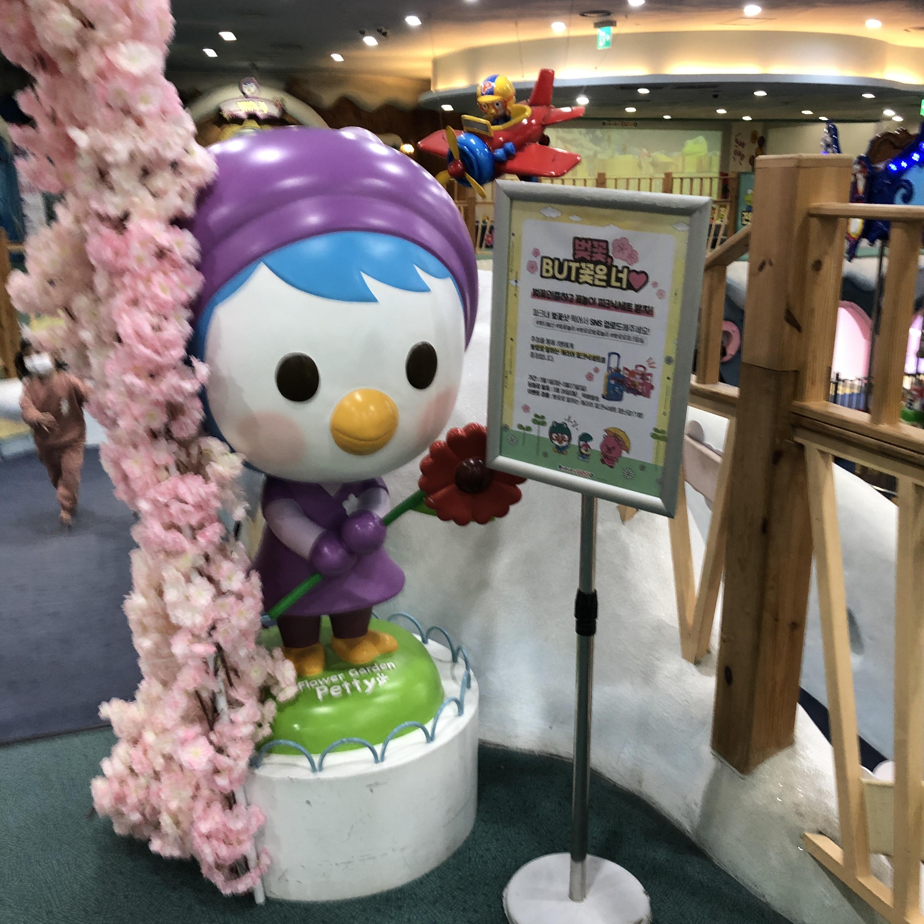 매표소에서 신발장으로 가는 길목에 있는 플라워가든 뽀로로와 패티입니다. 봄이라 벚꽃 조화로 꾸며놓은 길 옆에 뽀로로가 전시되어 있습니다. 뽀로로파크는 이처럼 온갖 곳에 다양한 크기와 모양의 뽀로로 캐릭터가 전시되어 있어 아이들의 창의력과 감수성을 키워줍니다.