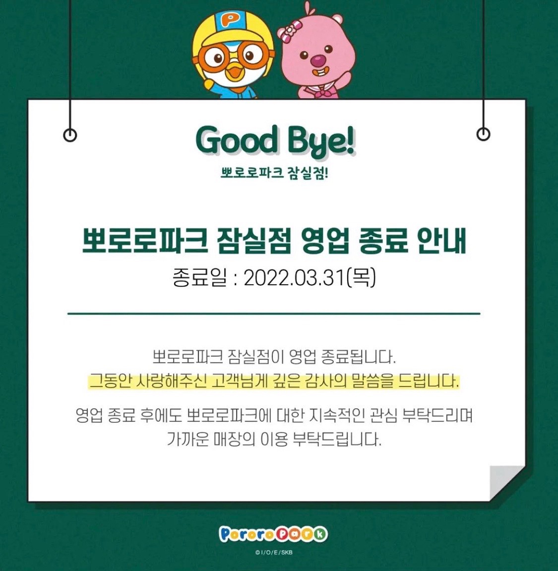 4. 굿바이 뽀로로파크 잠실 롯데월드점 : 22년 3월 31일부로 영업 종료