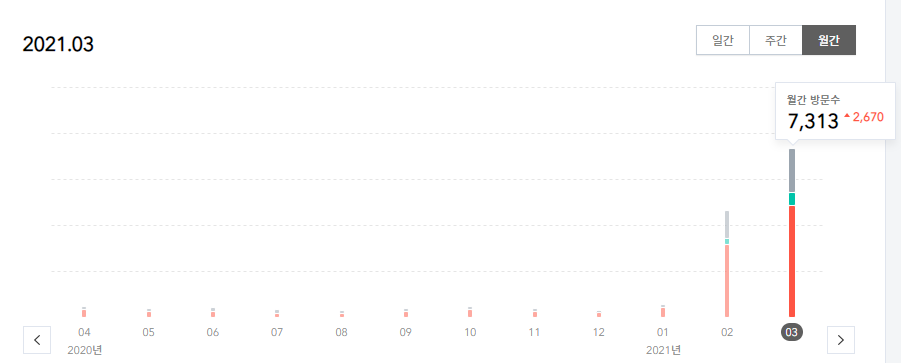 2021년 1월말부터 작심하고 글을 작성하기 시작하면서부터 점점 블로그 방문자가 증가하기 시작했습니다. 그래프로 보면 다음과 같이 기하급수적으로 늘어나는 것을 확인할 수 있습니다.