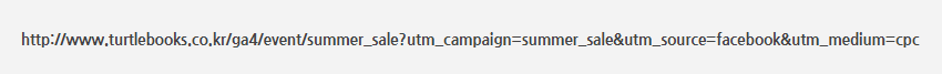 이 링크는 페이스북(source, 획득의 상세한 위치)에서 cpc광고(medium, 획득의 방식)를 통한 사용자 유입을 추적하는 여름 세일 캠페인(campaign, 광고의 이름 혹은 행동들의 이름)의 캠페인 링크입니다.