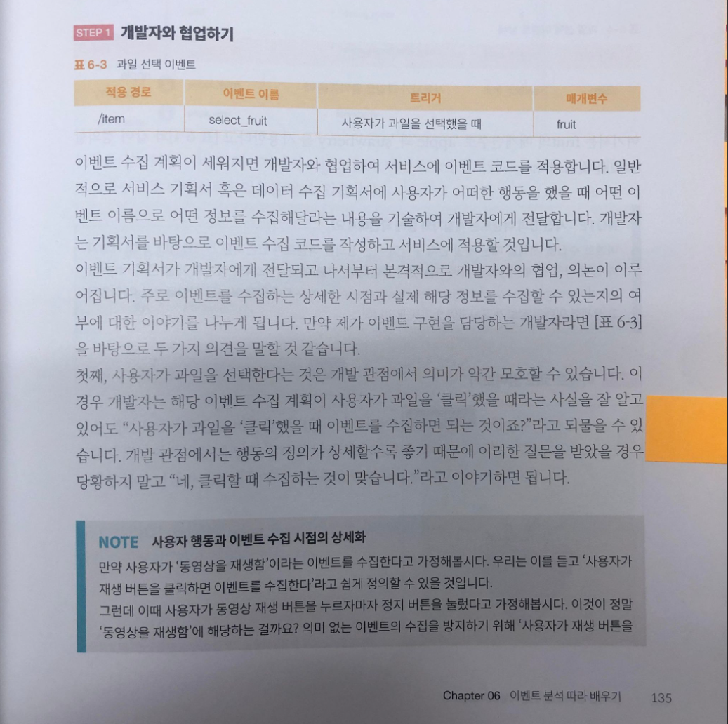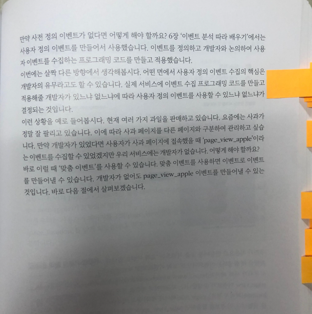 이때문에 저자는 사용자 정의 이벤트 수집의 핵심은 개발자의 유무라고 말합니다. 실제 서비스에 이벤트 수집 프로그래밍 코드를 만들고 적용해줄 개발자가 있느냐 없느냐에 따라 결정되기 때문입니다.
