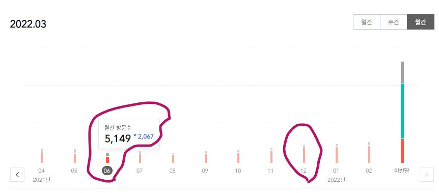 블로그에 글을 쓰기 시작하면서 3개월만에 방문자수가 24배 가까운 급성장을 보였습니다. 다른 광고를 전혀 하지 않고 오로지 순수 검색만으로 블로그에 유입되는 방문자였기에 매우 의미있는 방문 숫자였습니다. 그렇게 2021년 1년동안 꾸준히 글을 작성하였는데요. 2021년 3월이후부터 12월까지 최고 유입월과 최저 유입월은 다음과 같습니다.