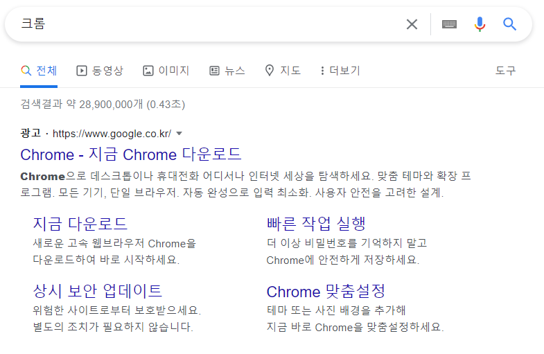 구글애널리틱스 실습을 시작하기에 잊지 말고 세팅을 해야 할 것이 있습니다. 바로 구글의 크롬 브라우저입니다. 구글에서 크롬을 검색하면 다음과 같이 나옵니다.