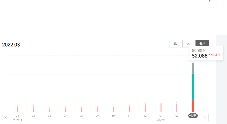 월간 최대 방문자 수가 10,000명을 넘지는 못하는 상황이었는데, 처음으로 2022년 2월에는 10,774명으로 드디어 월간 방문자수 1만명을 돌파하였습니다. 2020년 12월 305명에서 시작하여 1년만에 35배의 기록적인 성장을 했습니다. 저는 이것만으로도 무척 만족을 했습니다. 그러던 중 저와 온가족이 2월말에 코로나 오미크론에 확진이 되었습니다. 그러면서 코로나 확진된 경험을 간단하게 글로 썼습니다. 확진 후에는 코로나 생활지원금을 신청한 경험을 글로 적었습니다. 저는 그저 제 경험을 담담하게 적었을 뿐이었는데, 이 두 개의 글에 엄청난 방문자가 유입되기 시작했습니다. 아래의 그래프를 보듯이 3월 23일 현재 무려 52,088명이라는 방문자가 유입되었습니다. 2020년 12월 이후 무려 170배라는 기록적인 성장을 이루어낸 것입니다. 사실 이 기록은 블로그를 전문적으로 운영하는 분들에 비하면 낮은 수치기는 합니다. 하지만 저는 블로그를 제가 기록하고 싶은 것을 남기기 위한 취미로 운영하기에, 이러한 결과는 상당히 의미있습니다.