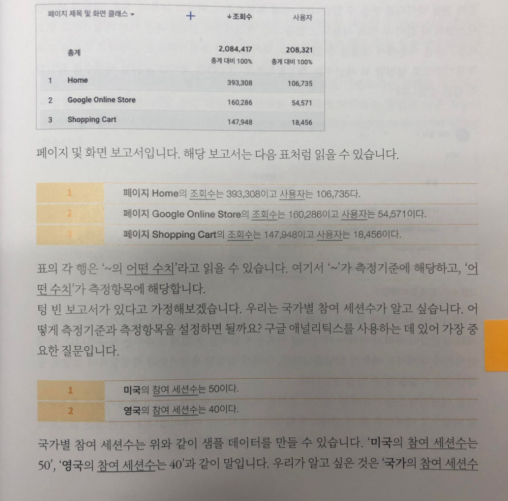 저자는 책의 내용을 진행하면서 위와 같은 질문을 독자에게 끊임없이 던집니다. 이러한 질문은 단순히 구글 애널리틱스의 기능을 이해하기 위해 던지는 질문이 아닙니다. 위의 질문 내용처럼 실제 업무에서 어떻게 데이터를 추출하고, 분석하고, 활용할 것인지에 관한 질문입니다. 단순히 데이터 분석은 데이터를 분석하는 것으로 끝내기 위함이 아닙니다. 데이터를 분석하고, 분석한 데이터를 바탕으로 업무의 효율성을 높이기 위함입니다.