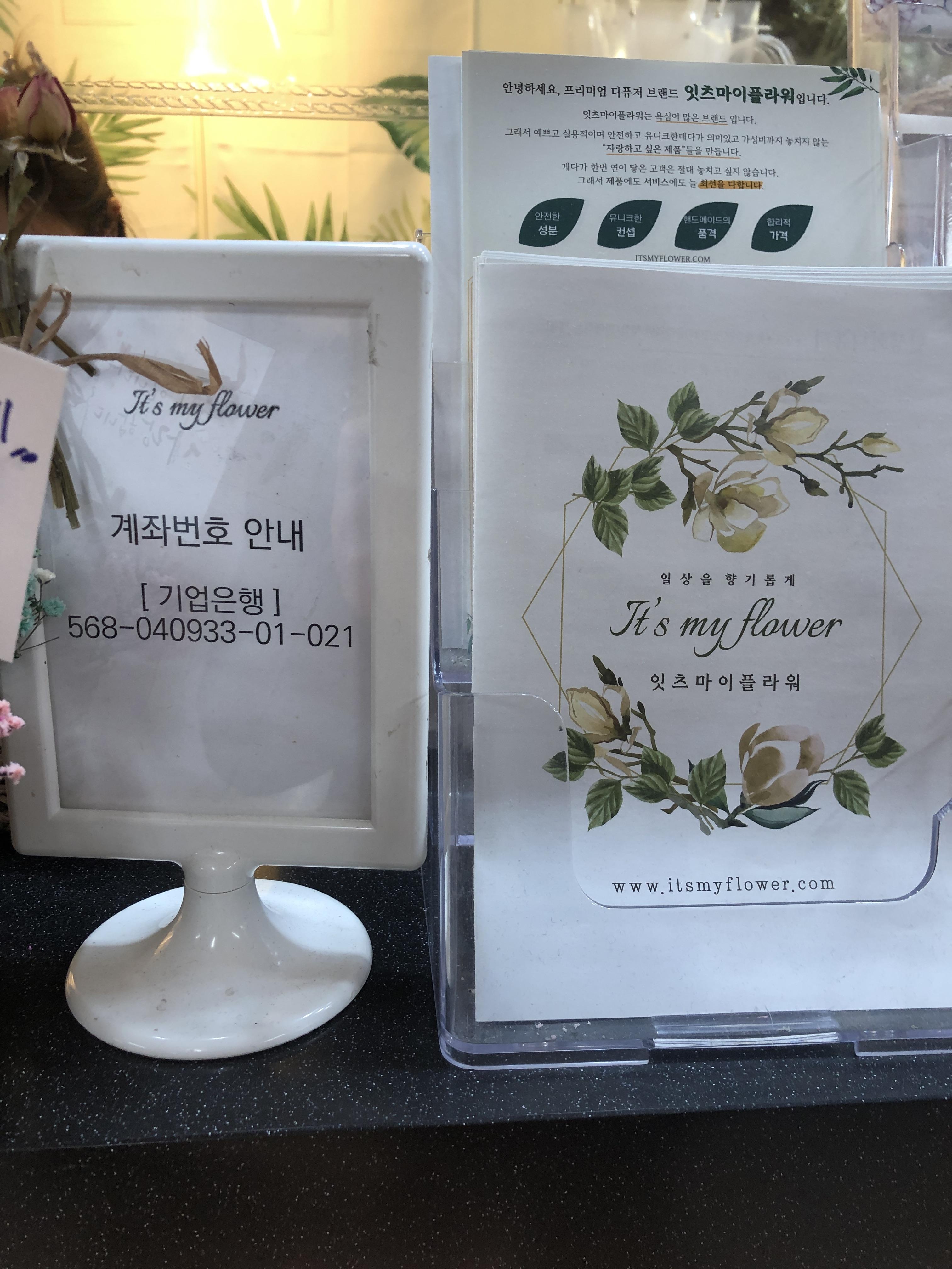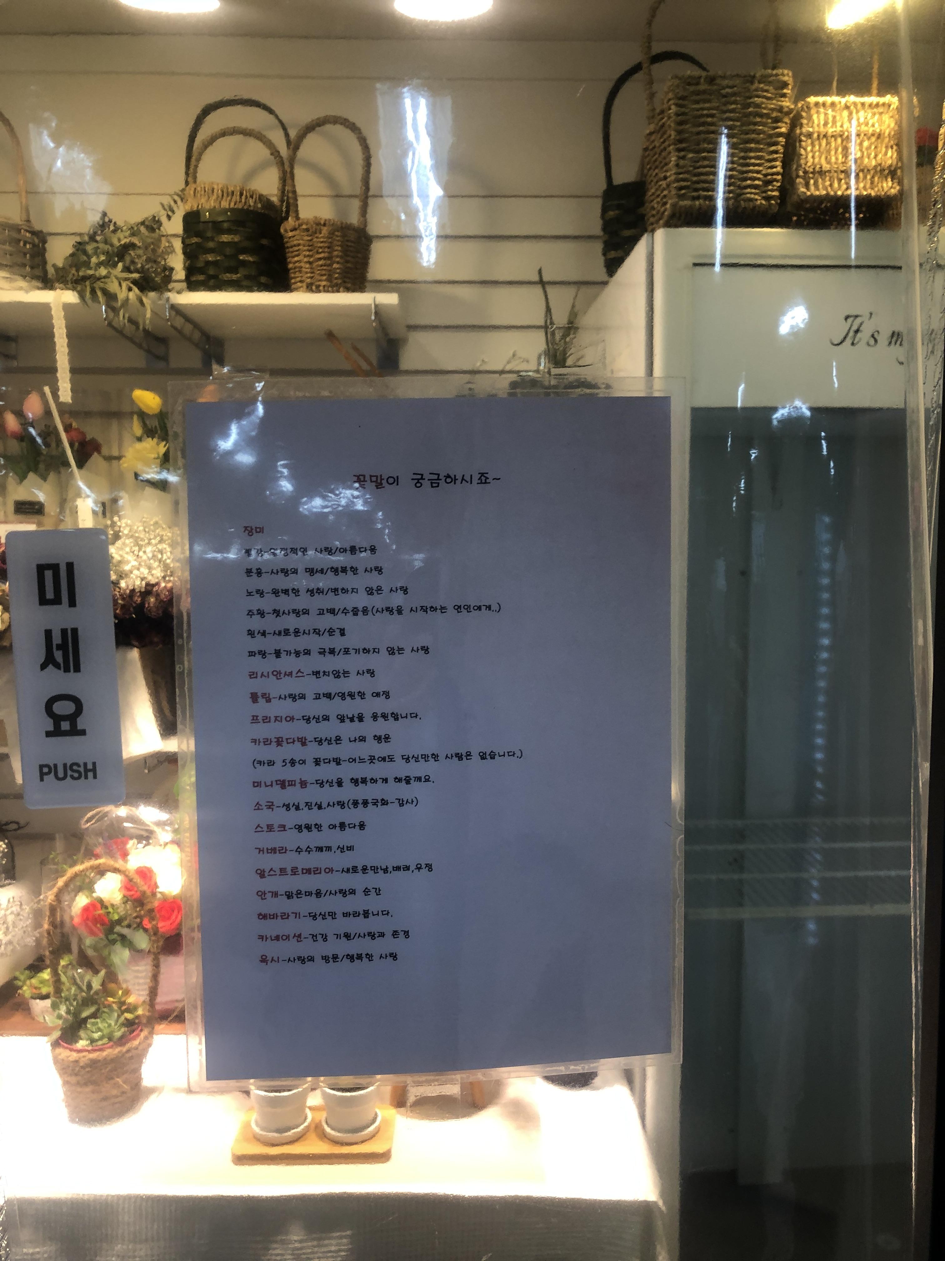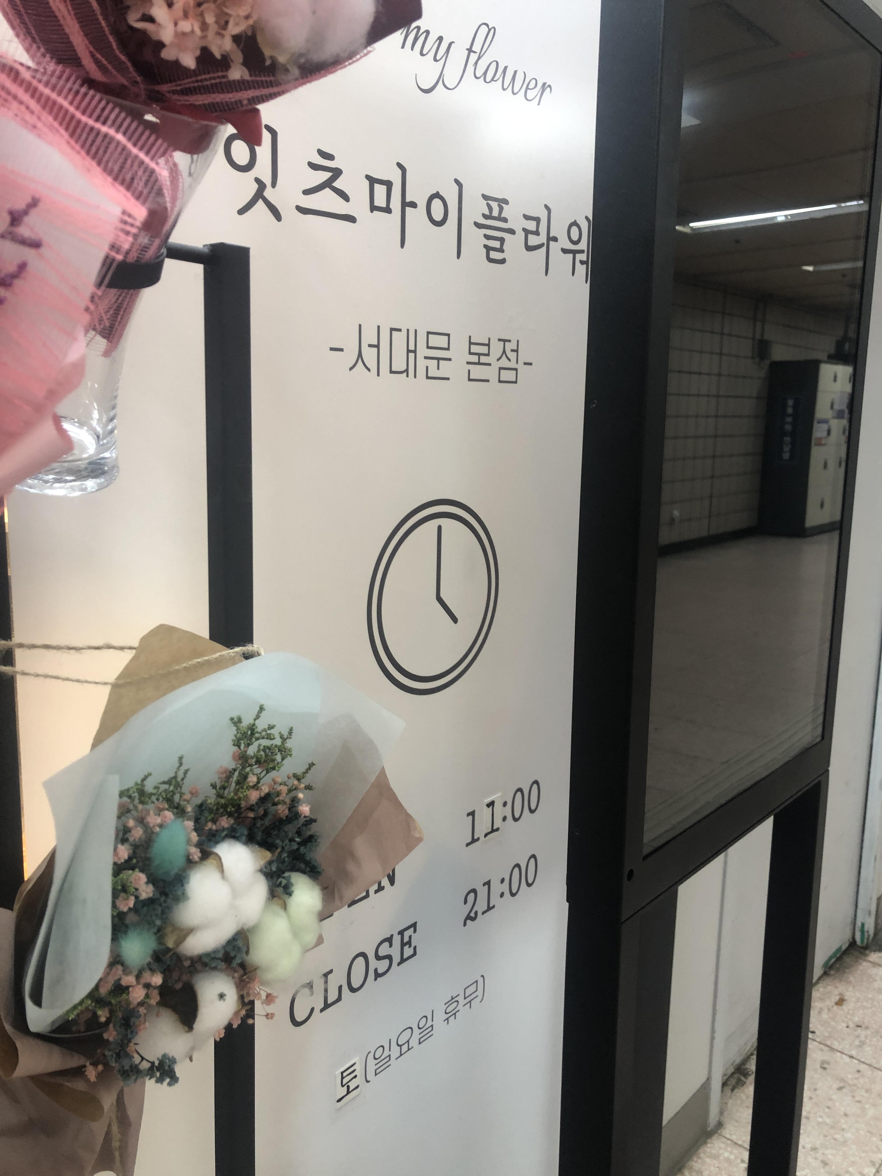 평일에는 오전 11시에 열어서 밤 9시에 닫는다. 늦게 까지 하는 꽃집이 별로 없어서, 밤 9시까지 하기에 내가 자주 이용할 수 있다.