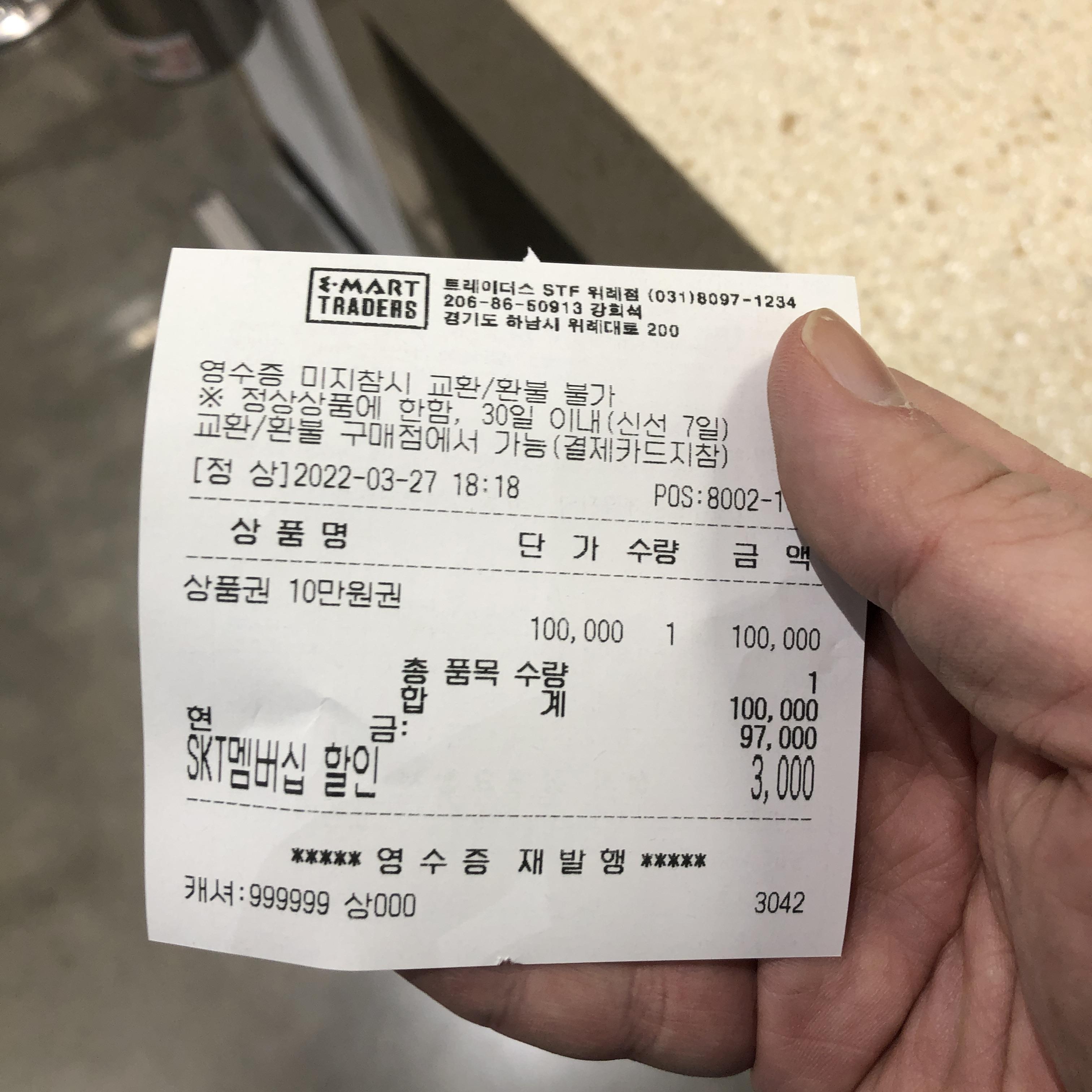 영수증에는 SKT멤버십 할인이 뜨며, 법인카드가 아닌 이상 현금으로만 구입 가능하다.