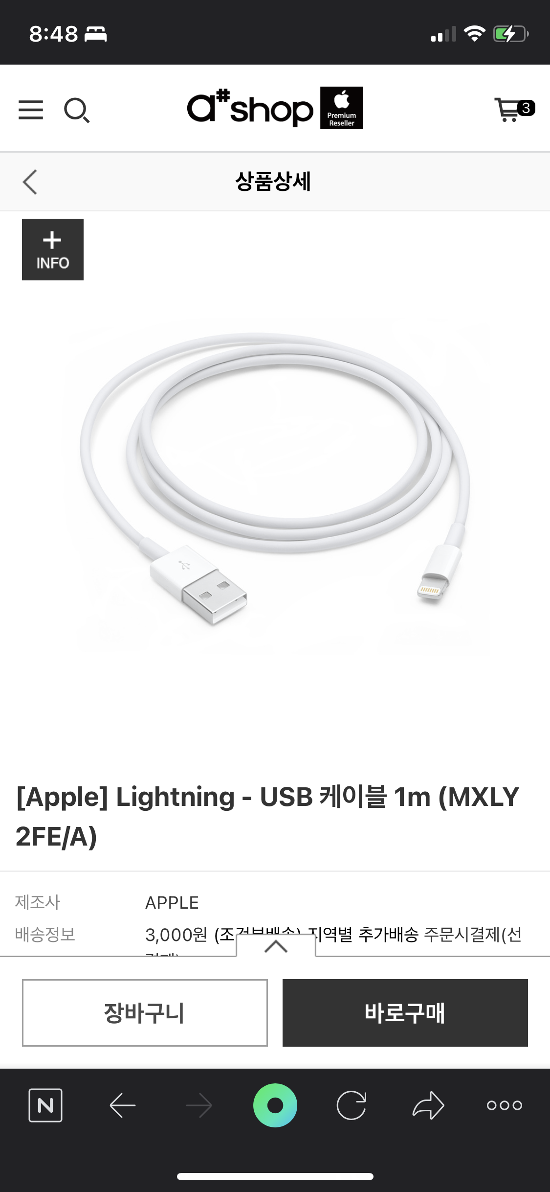추가로 라이트닝 USB 케이블 애플 Lightning - USB 케이블 1m (MXLY2FE/A)를 함께 구매했다. 따로 구매했으면 배송비가 붙었겠지만, 애플 펜슬과 함께 구매했기 때문에 배송료는 무료였다. 제품의 가격은 22,500원으로 역시 매우 저렴하게 구입할 수 있었다.