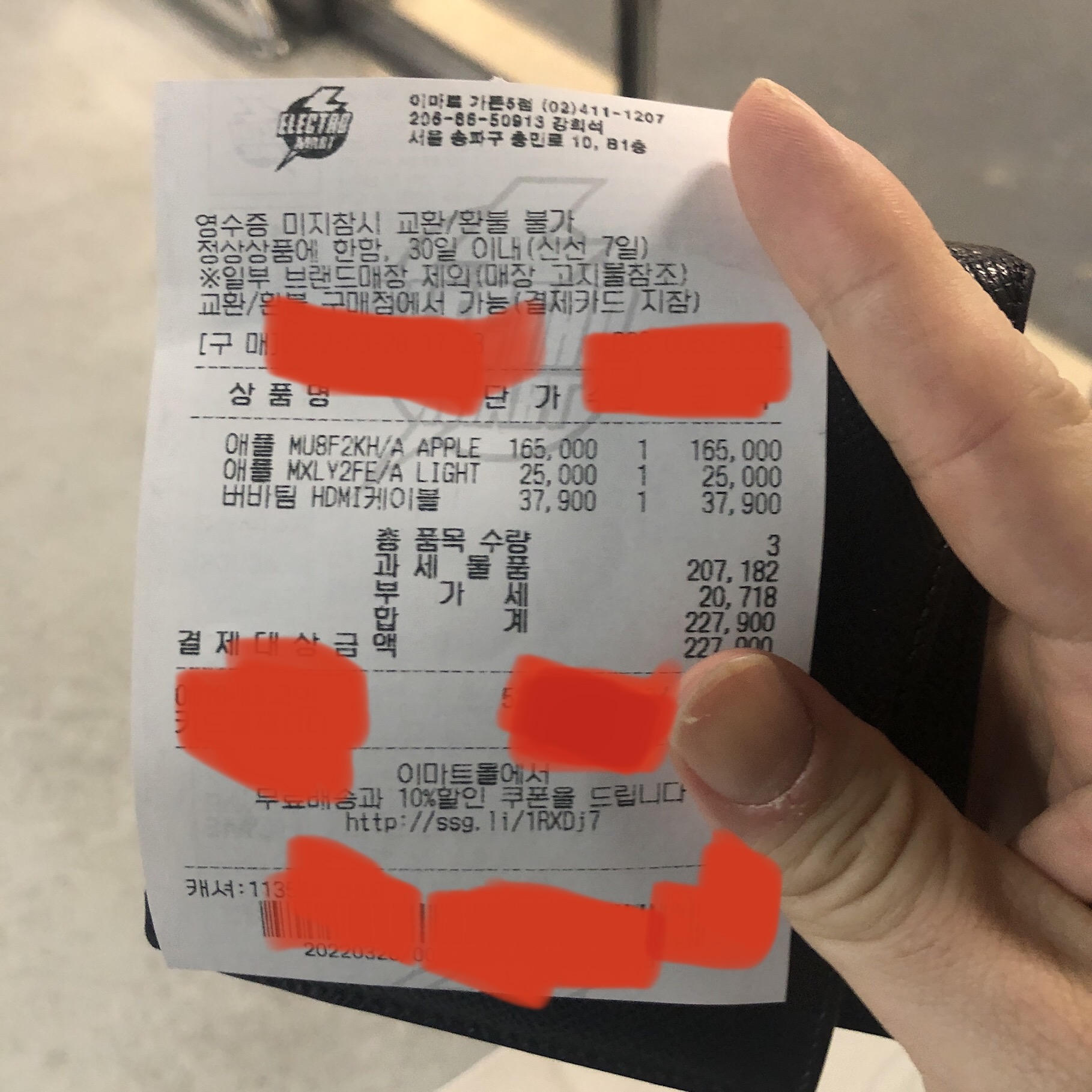 이마트 에이샵 오프라인 매장에 방문하여 애플 펜슬 2세대와 애플 라이트닝 USB 케이블, 버바팀 HDMI 케이블 총 3상품을 구입한 총액은 227,000원이었다. 이렇게 구입을 하고 집에 돌아왔는데, HDMI 케이블을 잘못 샀다는 것을 깨달았다. HDMI 케이블을 사는 것이 아니라 HDMI 케이블을 꽂을 수 있는 OTG 허브 포트를 구입해야 하는데 말이다. 허탈감에 망연자실했다.