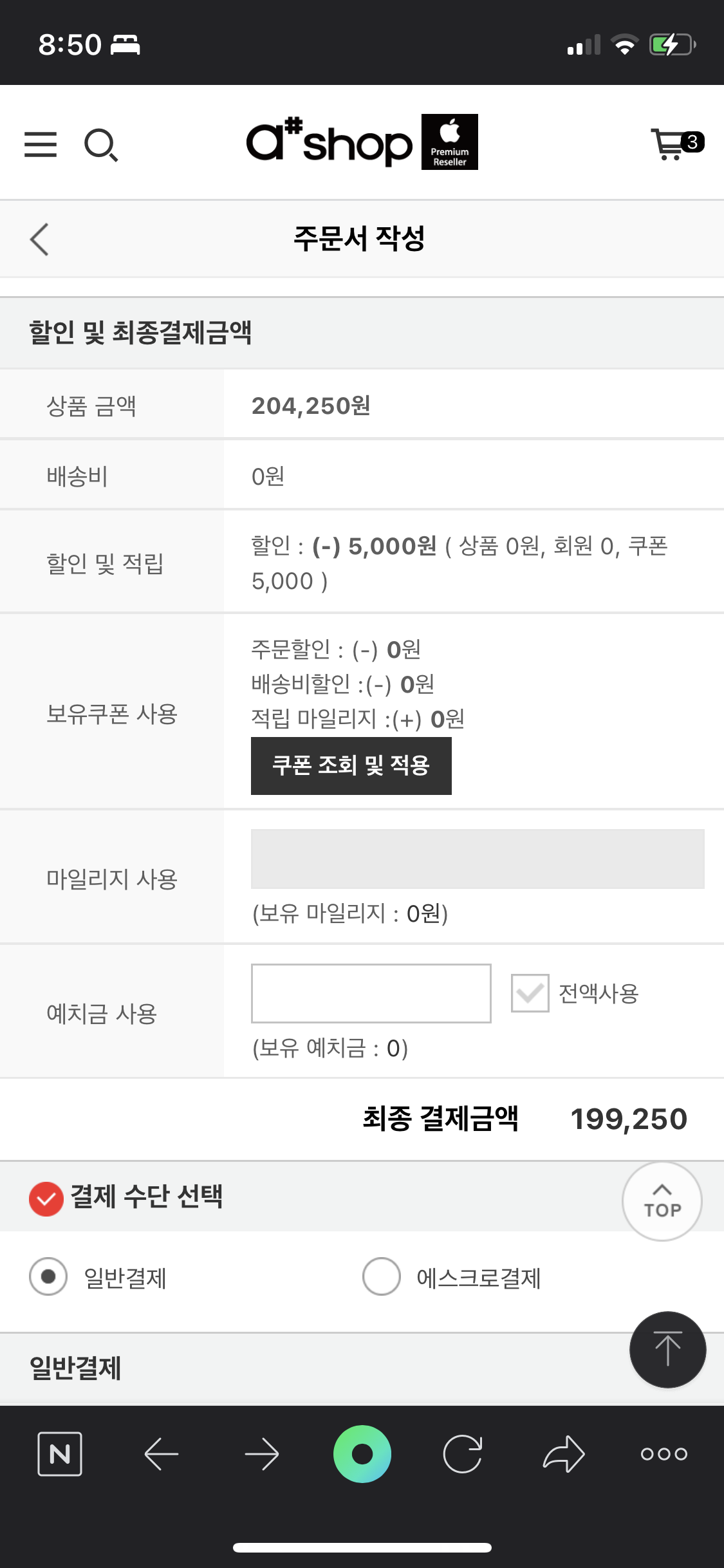 이렇게 에이샵 온라인 매장에서 3상품을 모두 구입한 결과 가격은 199,250원이었다. 매우 저렴하게 살 수 있어서 아주 만족스러웠다.