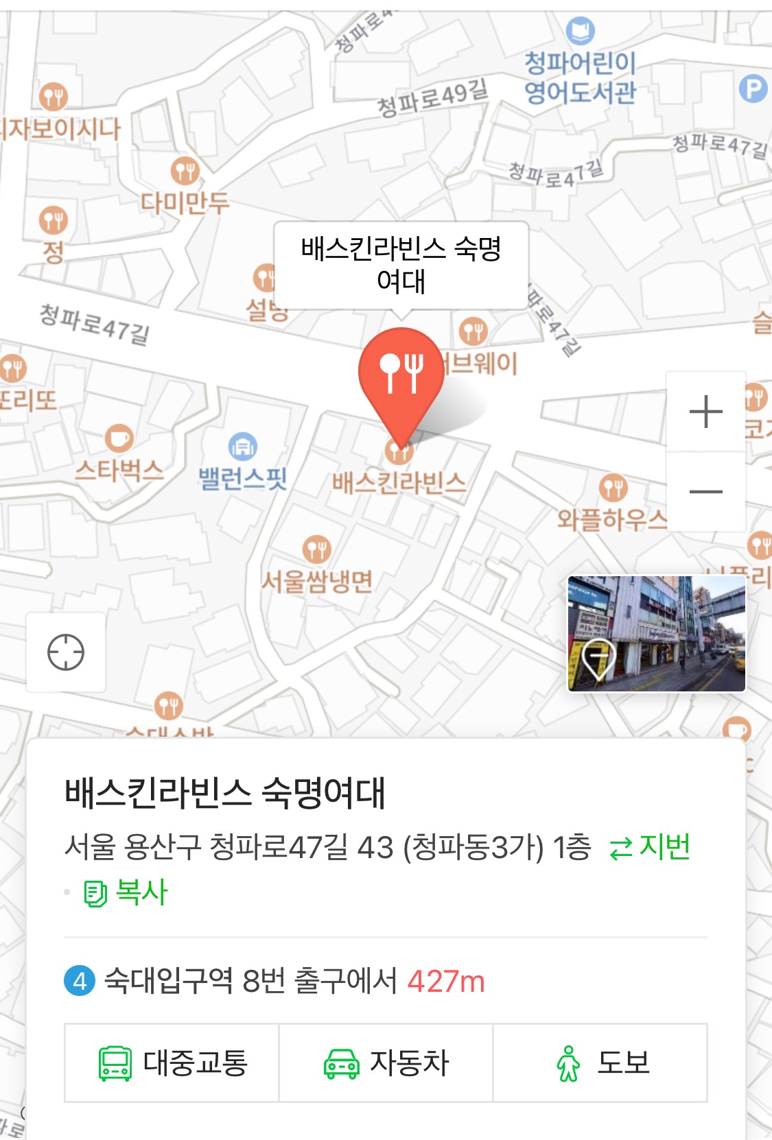 베스킨라빈스 숙명여대점의 위치는 서울 용선구 청파로47길 43이다. 와플하우스에서 5분 정도 숙대쪽으로 올라오면 있다.