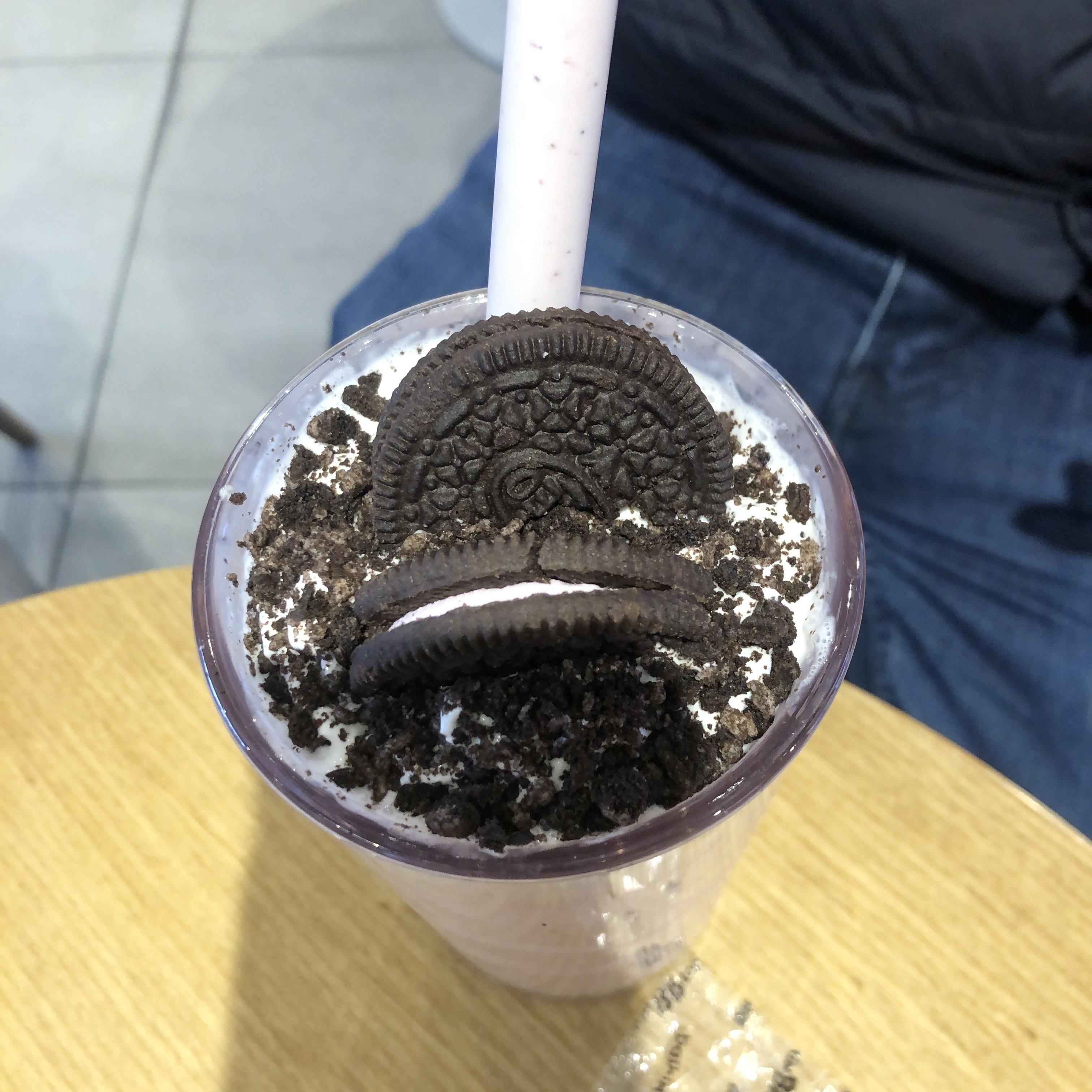 친구는 오레오 딸기 쉐이크를 시켰다. 베라에서 탑티어에 속하는 아이스크림인 베리베리 스트로베리로 만든 쉐이크에 오레오 크럼블을 듬뿍 올린 쉐이크다.