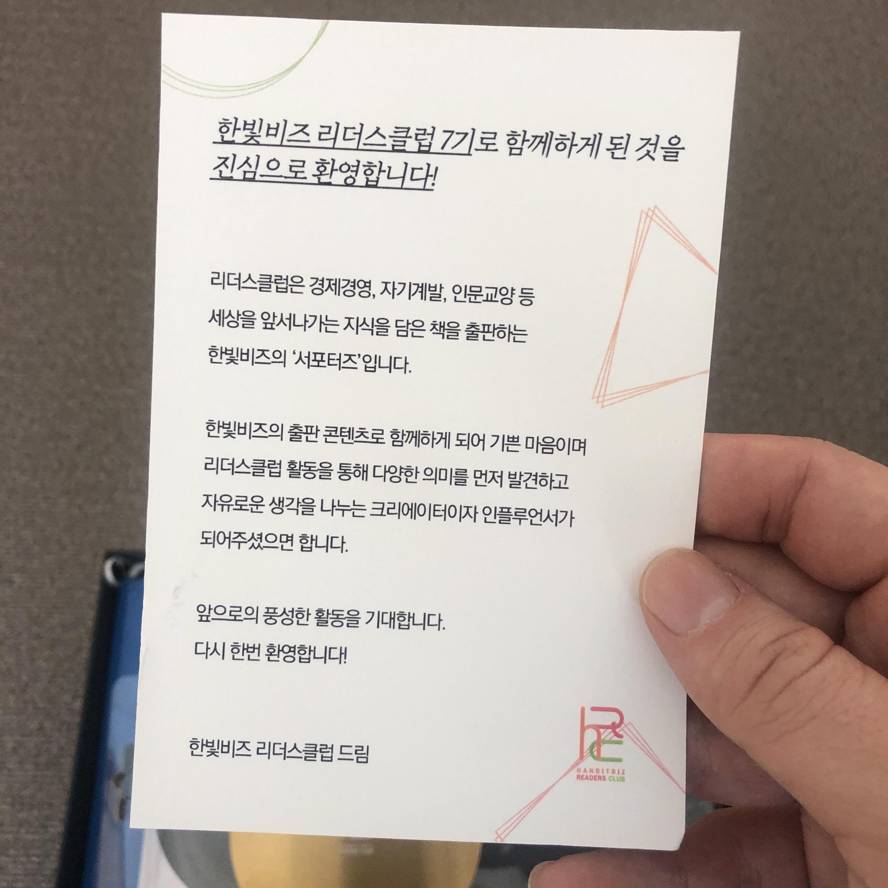 웰컴키트 속 웰컴 카드입니다. 리더스클럽 7기를 진심으로 환영하는 마음이 웰컴 카드 속에서 구구절절 드러납니다.